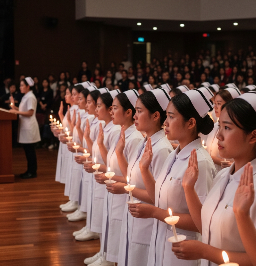 나이팅게일 선서식은 간호사로서의 사명과 책임을 처음으로 자각하는 의식입니다. 촛불을 밝히며 나이팅게일의 등불 정신을 이어받겠다고 다짐하는 순간이죠.