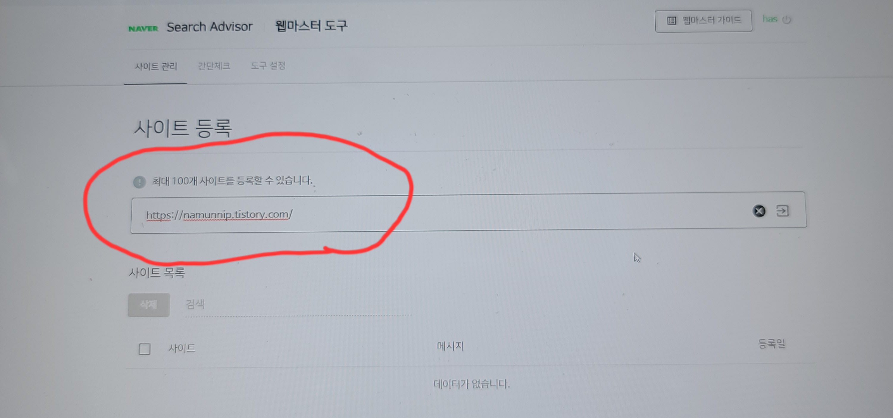 그럼 사이트를 등록할 수 있는 화면이 뜹니다. 사이트 등록 란에 본인의 티스토리 블로그 주소를 넣은 뒤 확인을 누릅니다.