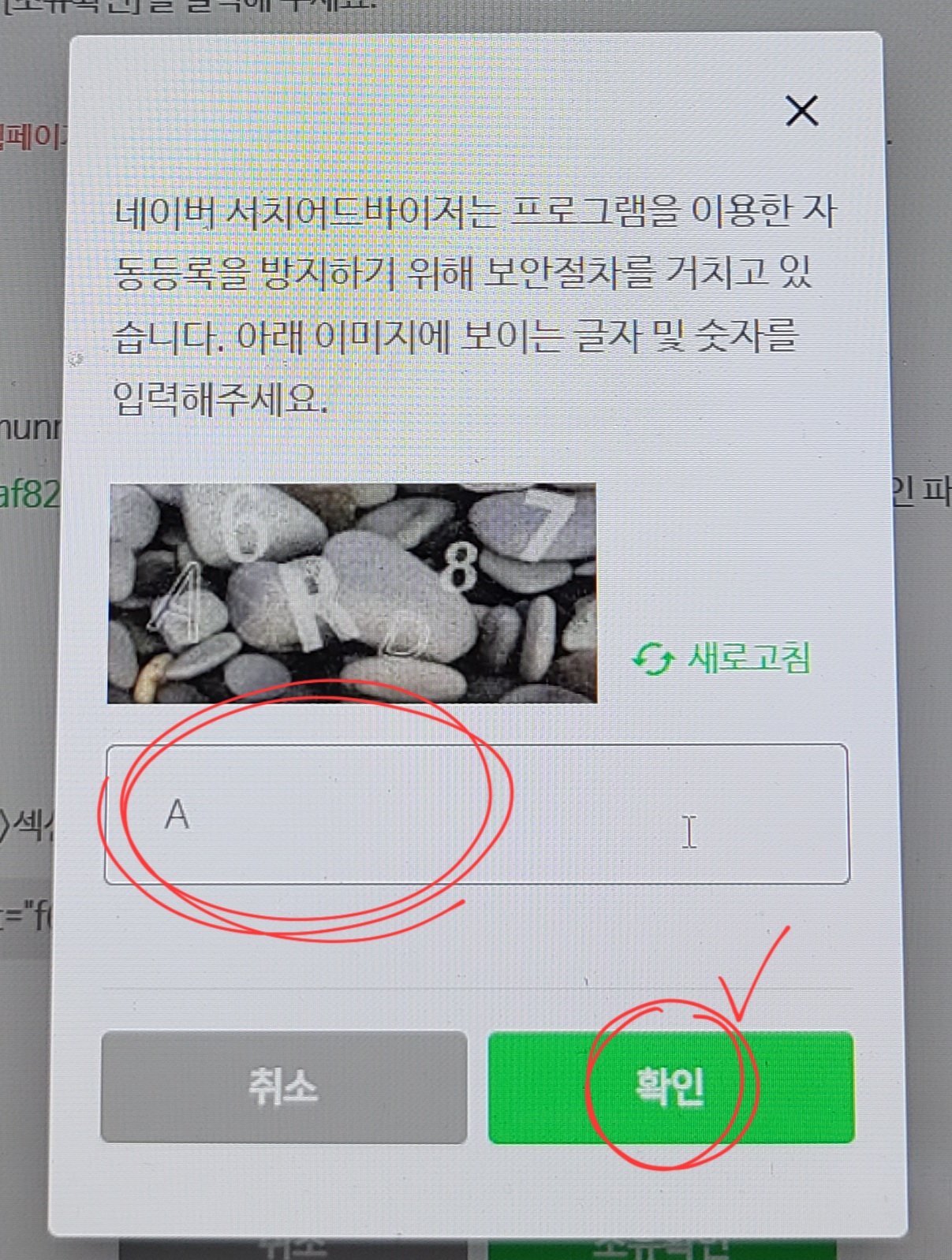 로봇이 아님을 증명하는 숫자와 영어를 기입한 뒤 확인을 누르면