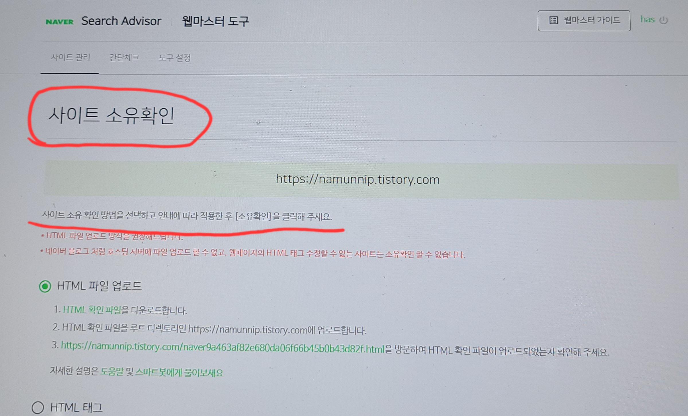 사이트 소유확인 화면으로 넘어옵니다.