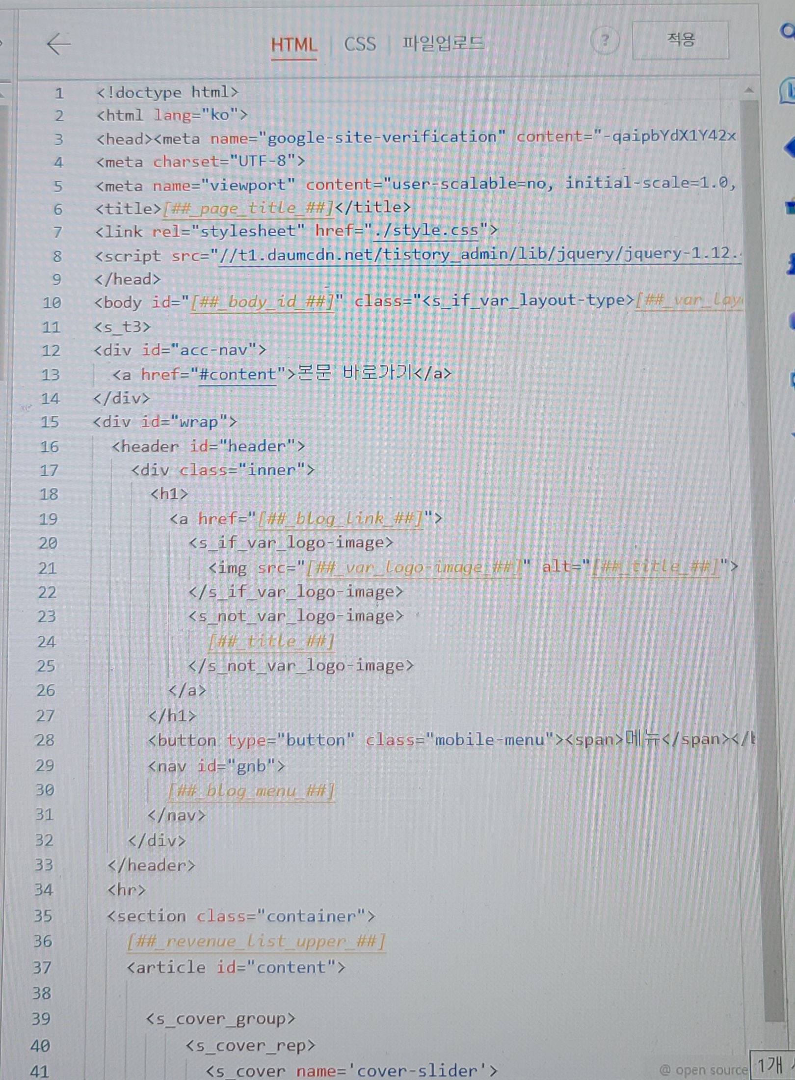 그럼 HTML코드를 편집할 수 있는 창이 뜹니다. 저희는 티스토리 구글 검색 노출을 한 방법과 똑같이 <head> 뒤편에 복사한 html코드를 붙여 넣을 거예요.