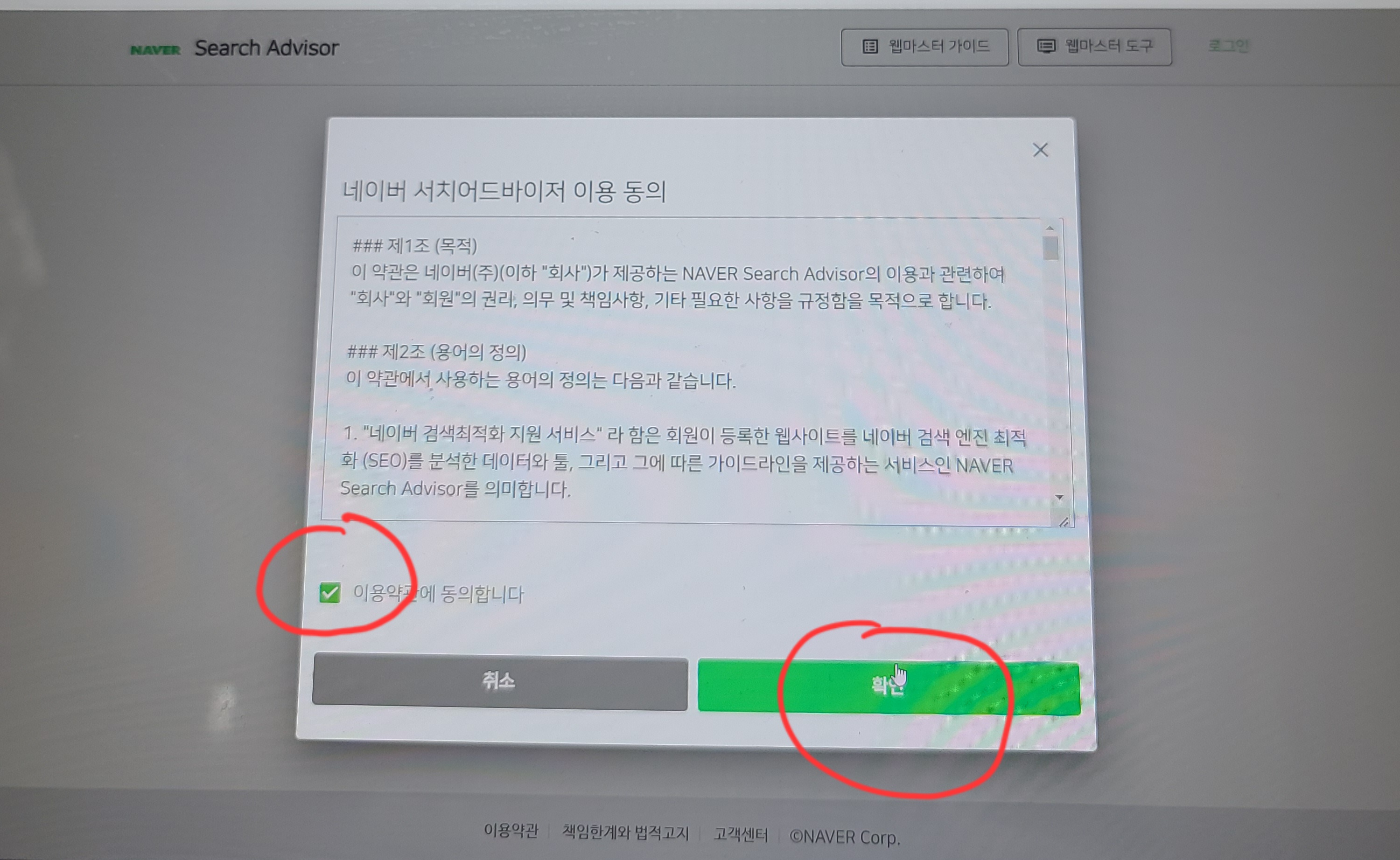 그럼 네이버 서치어드바이저 이용 동의서가 뜨는데요. 동의합니다를 누르고 확인을 눌러주세요