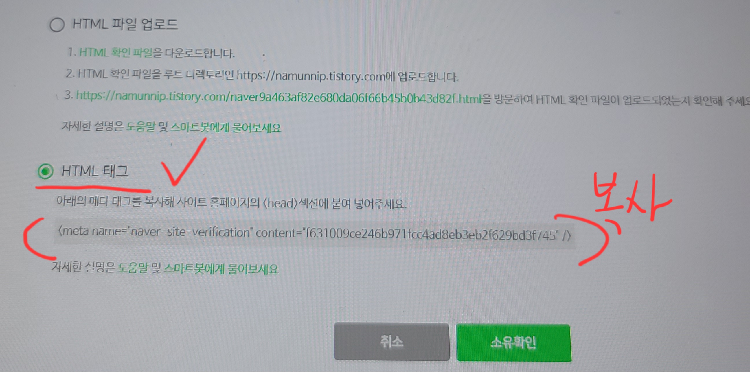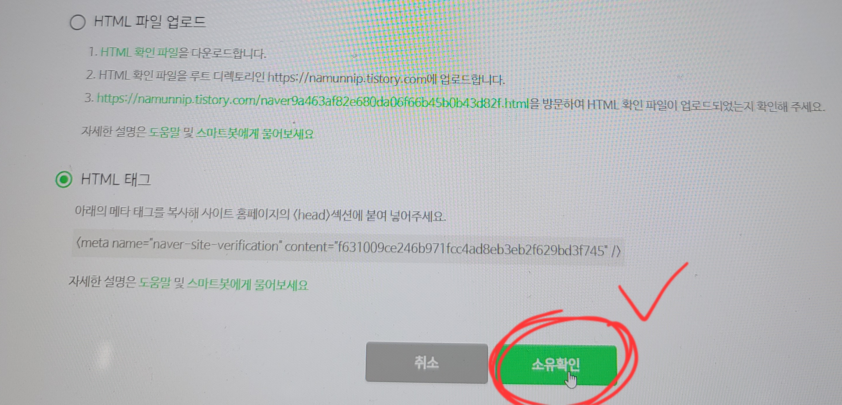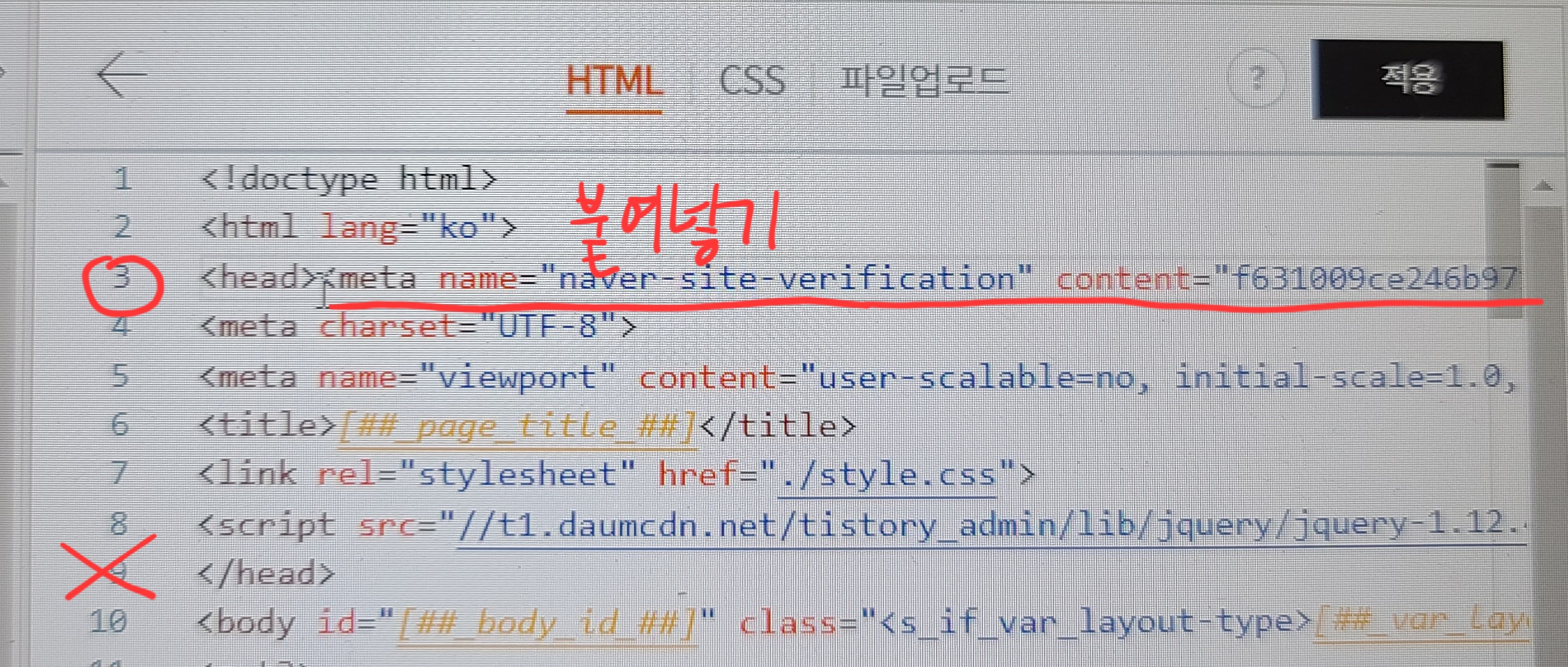 티스토리 html편집에서 3번 칸 뒤에 정확하게 코드를 붙여 넣기 한 뒤 적용까지 마쳤다면, 소유확인란은 무사히 넘어가게 됩니다.