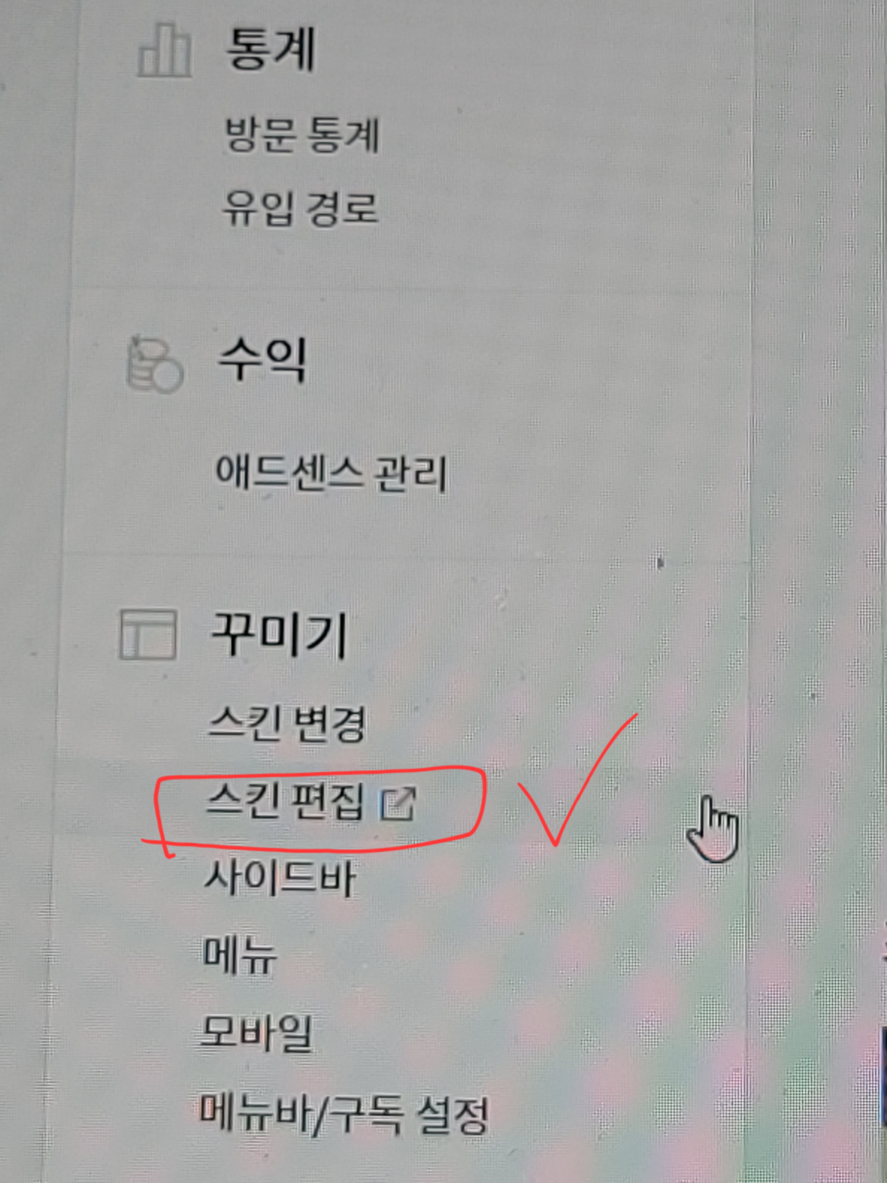왼쪽 메뉴바를 보면 됩니다. 꾸미기 아랫 편에 위치한 스킨편집을 눌러주세요.