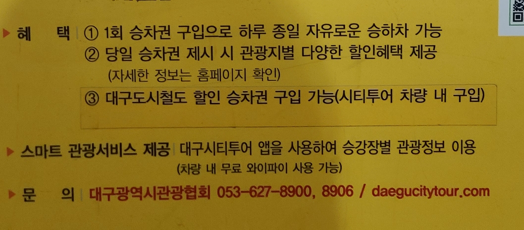 - 대구도시철도 할인 승차권을 시티투어 차량 내부에서 구입이 가능합니다.