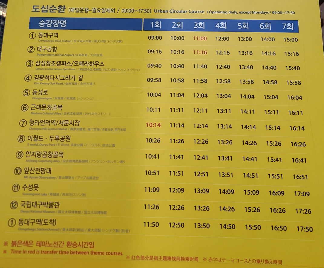 대구시티투어 도심순환 코스 시간표