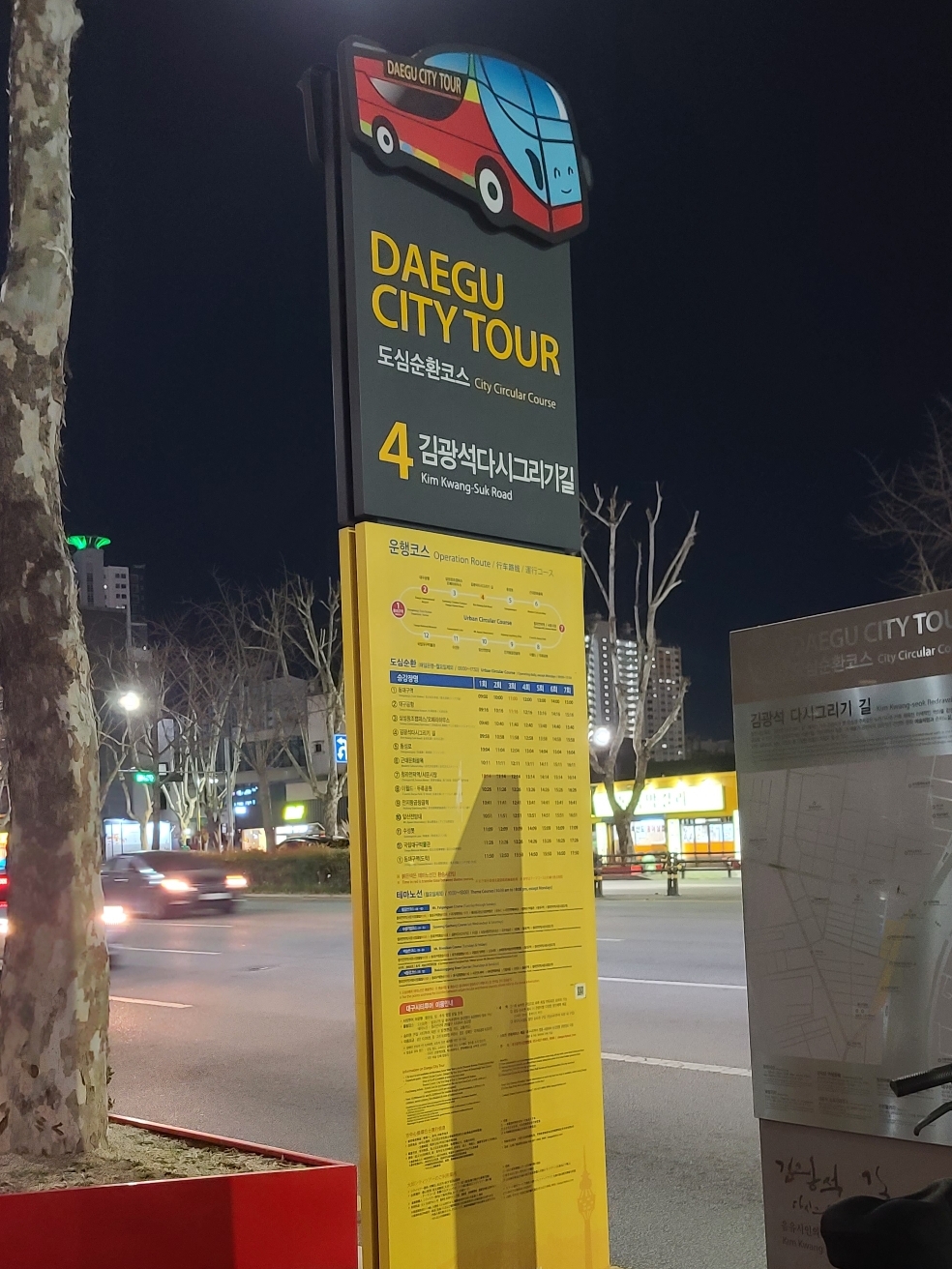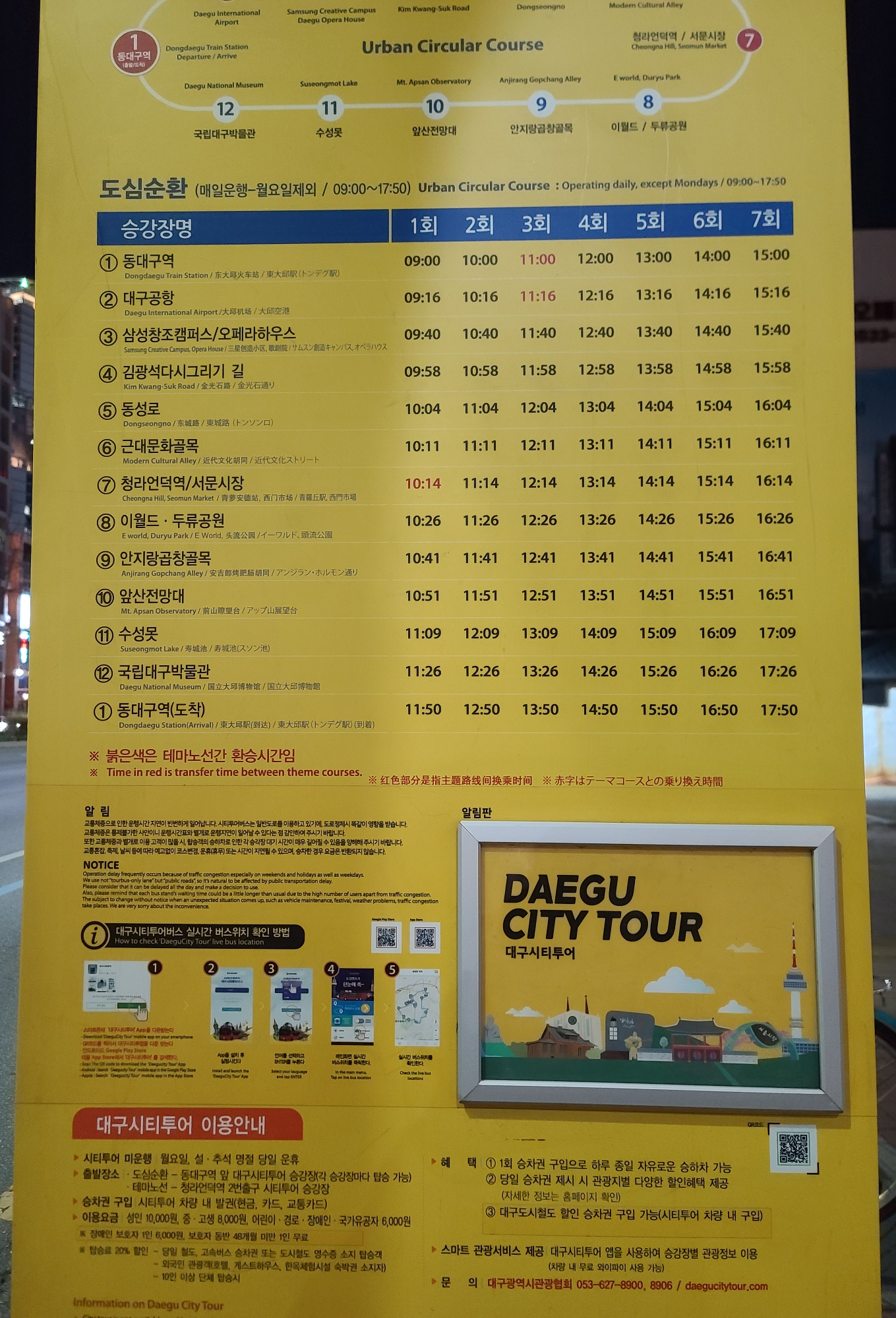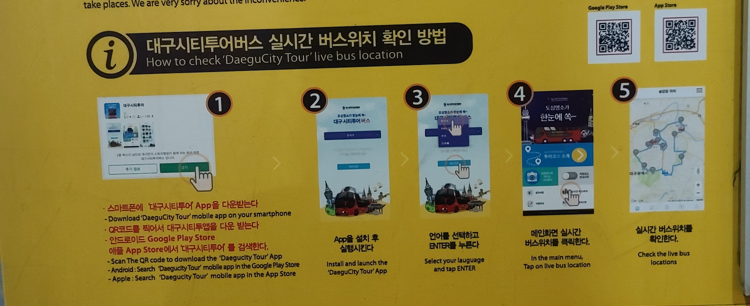 정류장에서 대구시티투어 티켓 구매방법, 이용방법, 어플 큐알코드, 시간표, 코스 등을 다시 확인할 수 있습니다.
