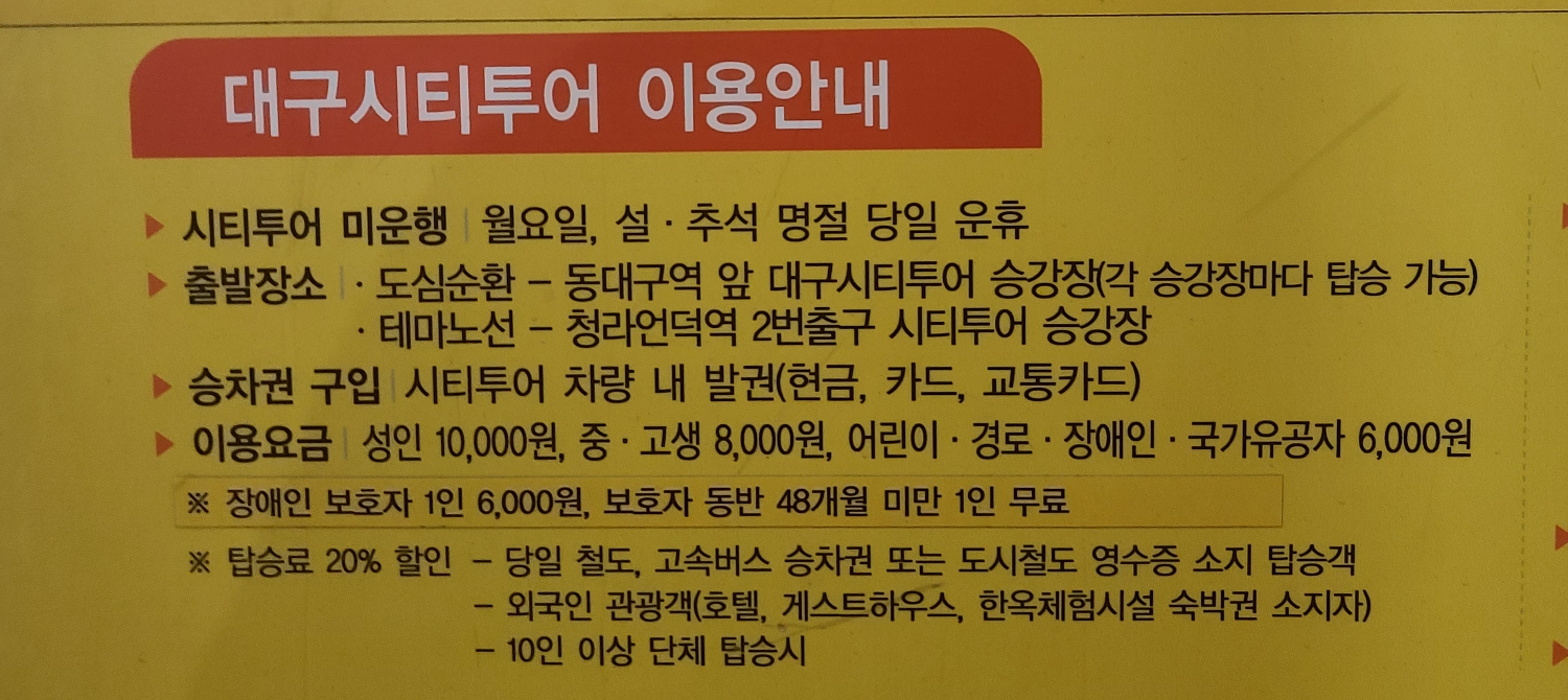 지금까지 대구 시티 투어 버스 시간표 코스 이용방법 요금 등을 알아보았습니다. 즐거운 대구 여행 되세요!