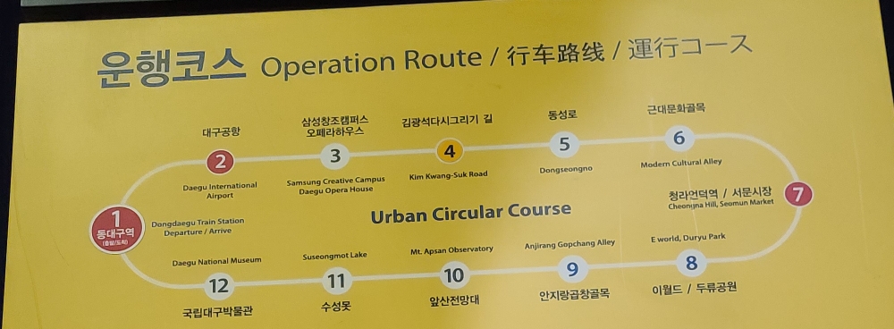 순으로 대구 시티 버스가 이동하게 되고요. 관광하려는 목적지에 내린 후 관광하다가 다시 대구 시티 투어 버스 정류장에서 버스를 타면 돼요.