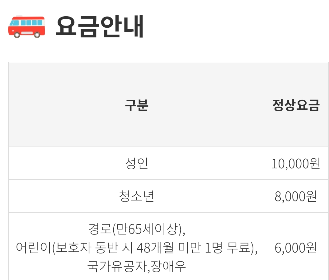 만 65세이상, 어린이, 국가유공자, 장애우, 장애인 보호자 1인 6,000원