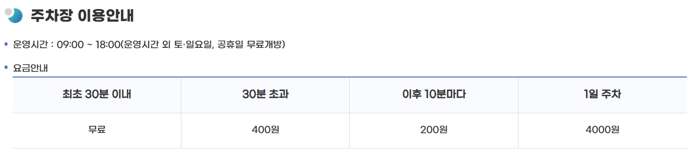 즉, 주말 방문 시 별도의 요금 없이 주차가 가능합니다. 주차면수는 총 100면이며, 일반 88면, 장애인 3면, 전기차 4면, 경차 5면이 마련되어 있습니다.