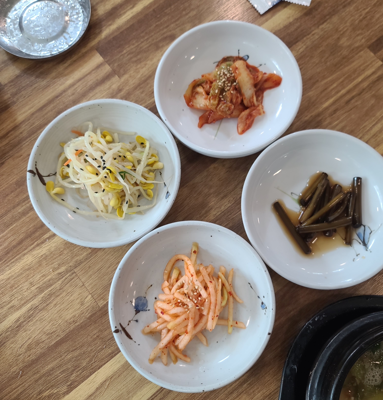 그리고 대구 한식 맛집 다운 밑반찬이 나옵니다. 김치와 무절임 콩나물이 정갈한 접시에 담겨 나옵니다.