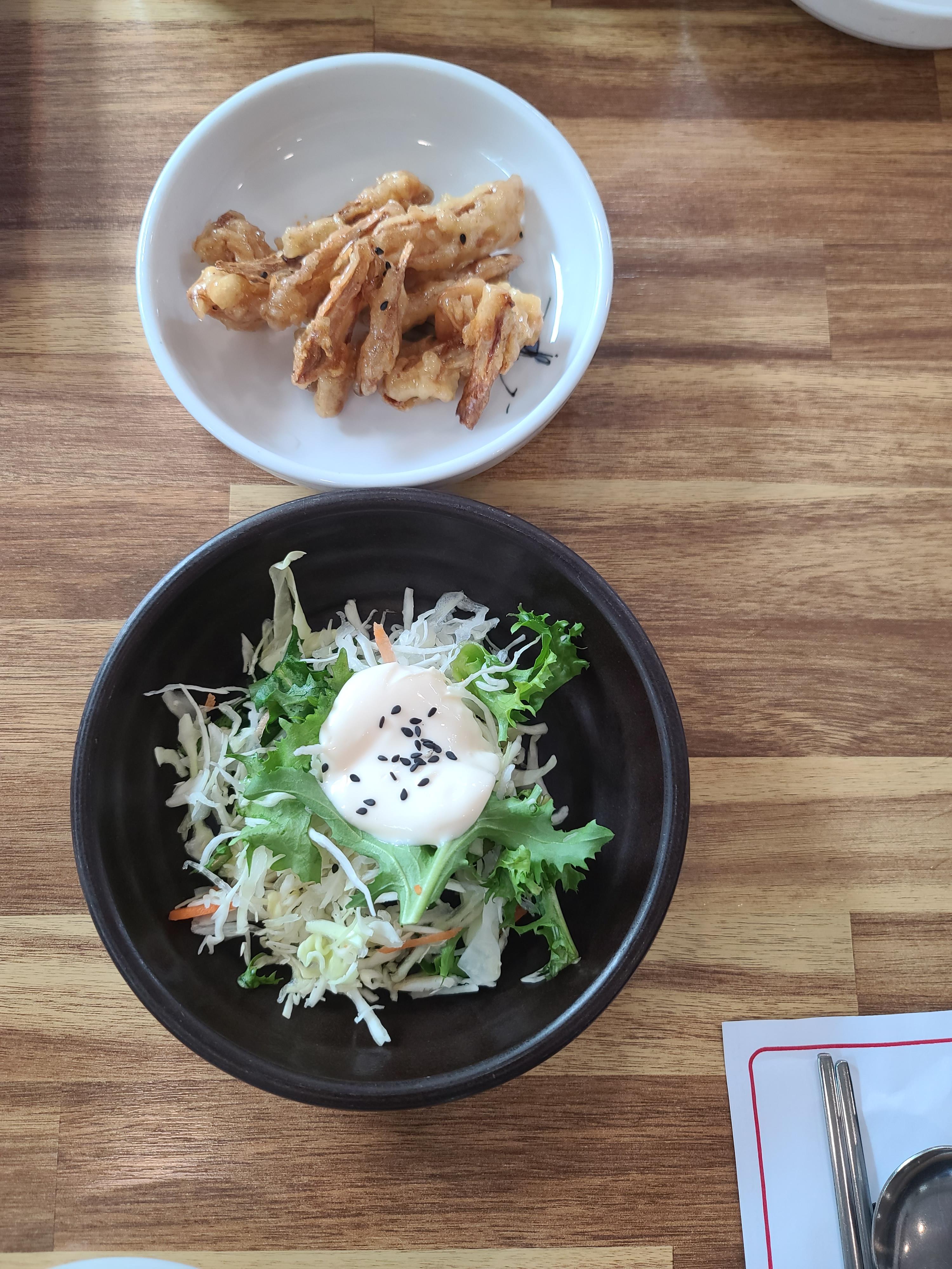 이 식당은 시그니처 우엉튀김이 있습니다. 뿐만 아니라 다양한 밑반찬이 나옵니다. 메인 메뉴와 함께 즐기기 좋습니다.