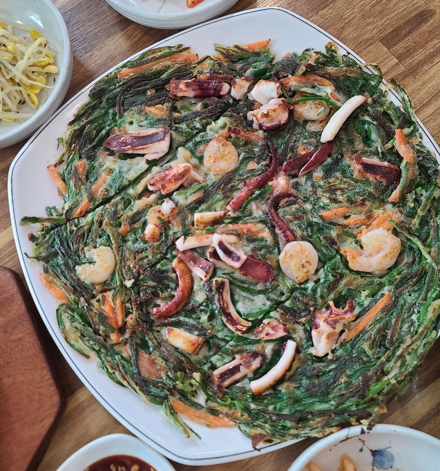 해물파전도 주문해보았습니다. 촉촉한 밀가루 전이 맛있습니다. 적절하게 소금간이 되어있어 간장에 찍어먹을 필요도 없었어요. 오징어와 새우가 듬뿍 들어가있어 씹는 맛도 좋습니다. 바삭하고 촉촉함이 공존하는 반월당 부자식당 해물부추전. 먹어볼만 합니다.