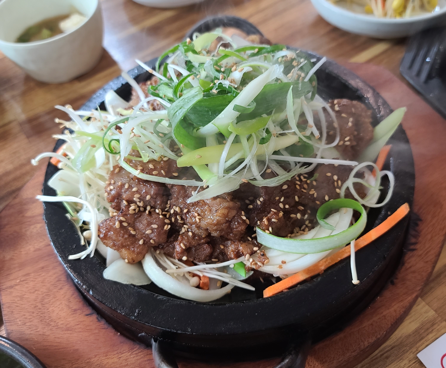 석갈비 2인분 입니다. 철판 그릇에 담겨서 나오는데요. 덕분에 식지않고 따뜻하게 석갈비를 맛볼 수 있었습니다. 양껏 올라간 대파와 아래에 깔린 양파들이 갈비의 색을 돋워줍니다.