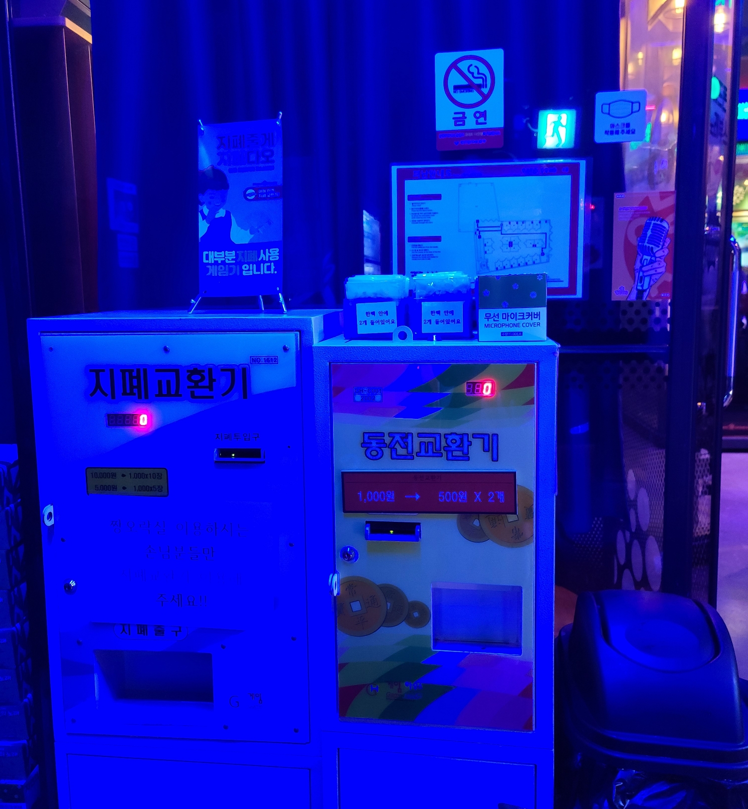 500원짜리 동전으로도 코인노래방 이용이 가능하지만 10000원권 지폐만 있다면 동성로 짱오락실 내부에 있는 지폐교환기를 이용할 수 있습니다.