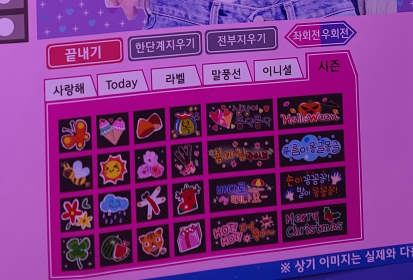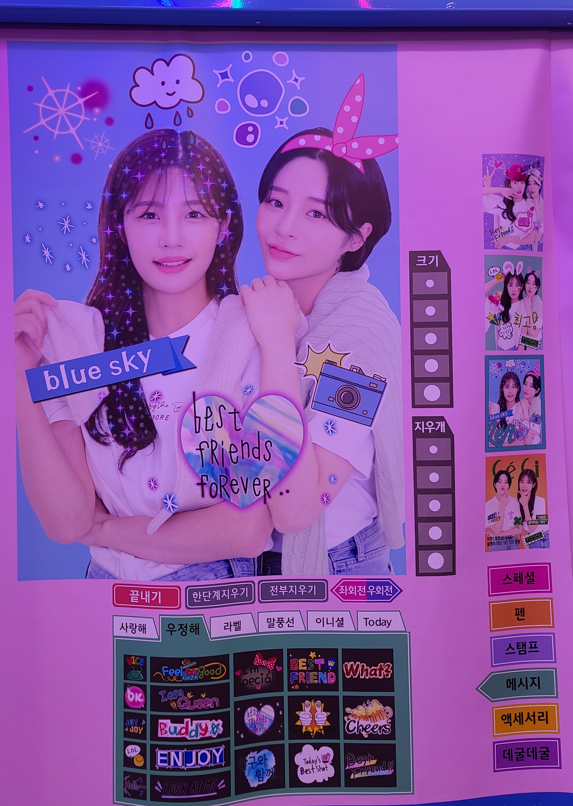 휴 다행히 갸루 느낌의 일본 스티커사진은 아니군요. 많이 한국화 되었어요. 글을 쓴다거나 스티커를 붙이는 기능은 옛날과 비슷하지만 보정은 전혀 안 비슷합니다.