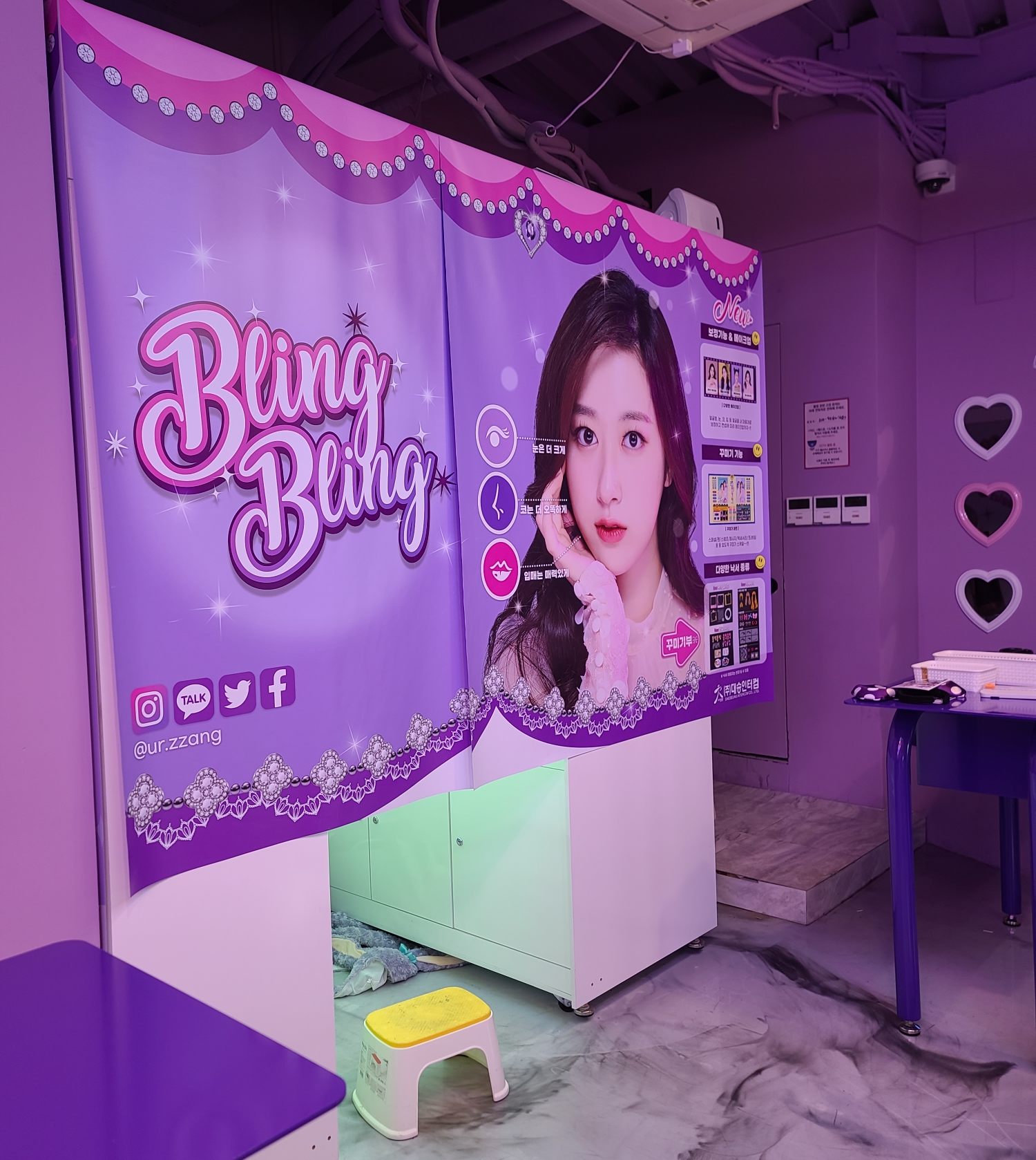 얼짱 가게 안에 약 4개, 5개 정도의 스티커사진 기계가 있었던 것 같아요. 그리고 콘셉트에 충실하게 모두 보라색 커튼입니다.