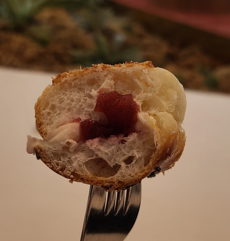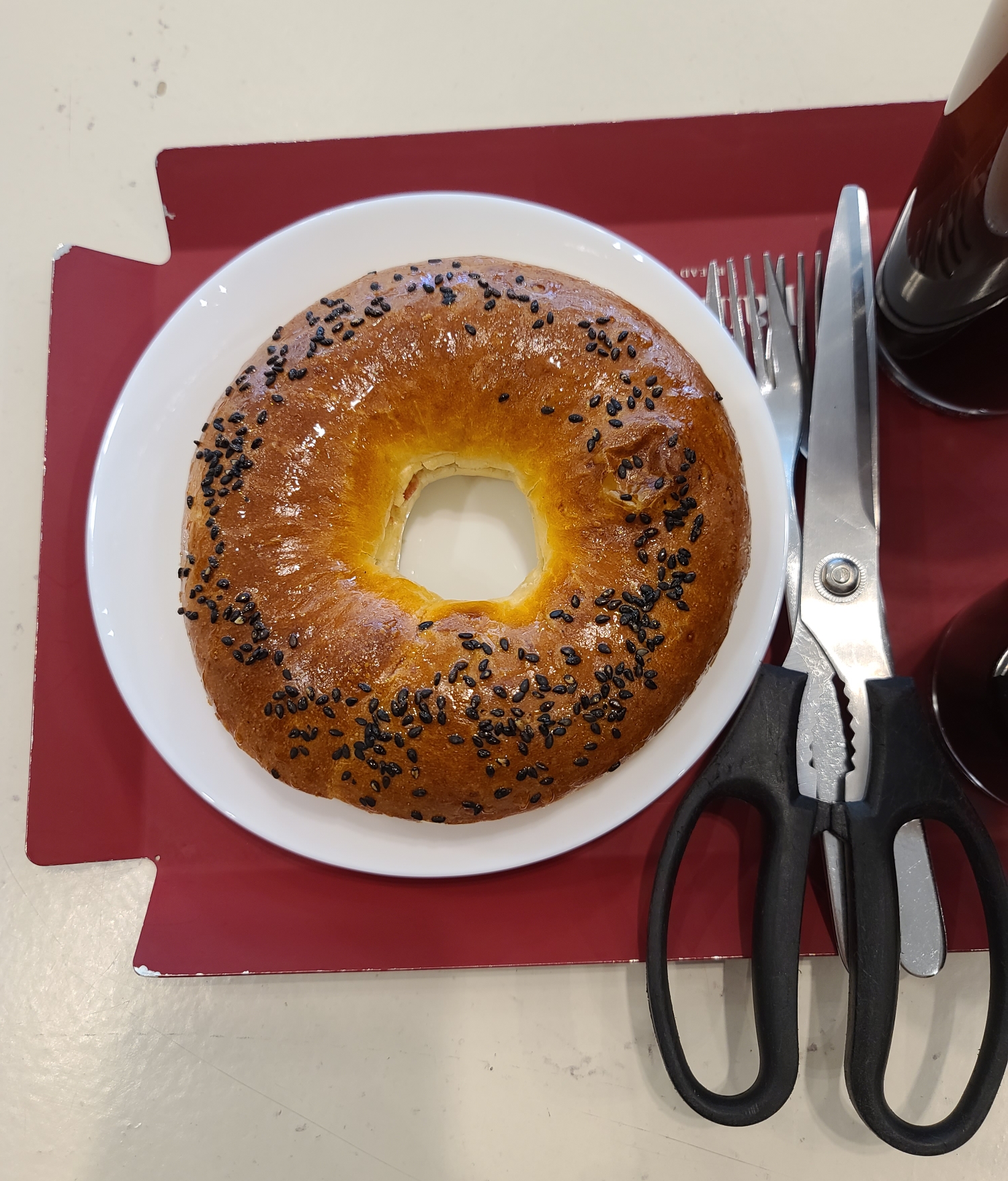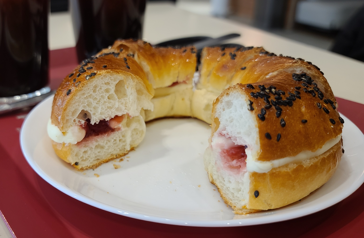 역시 칼보다는 가위가 빵 컷팅에는 제격입니다. 단면을 보시면 양 옆으로 크림치즈가 가득합니다. 그 사이로 딸기잼이 채워져있습니다. 베이글은 딱딱하지 않고 상당히 부드럽답니다.