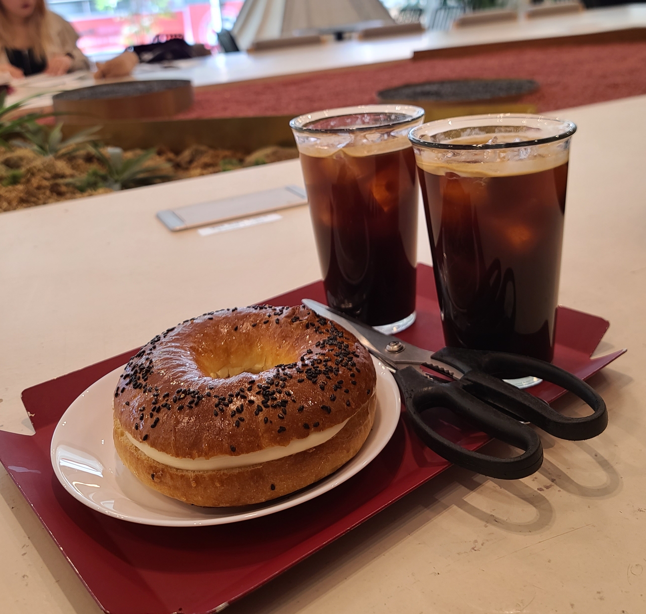 커다란 베이글 안에 크림치즈와 딸기잼이 덧발라져있습니다. 굉장히 상큼한 맛이예요. 잘라먹을 수 있도록 가위도 같이 줍니다.