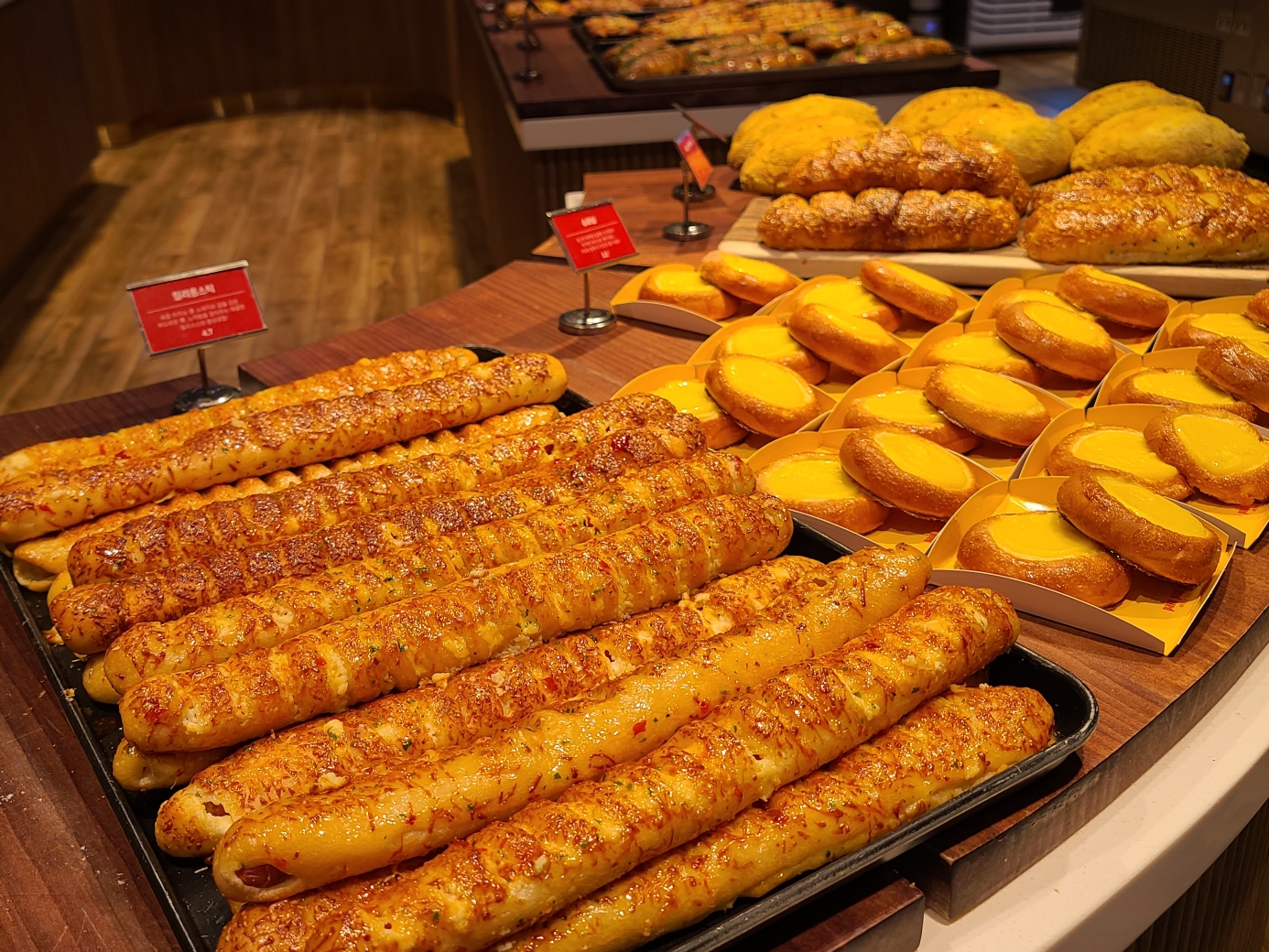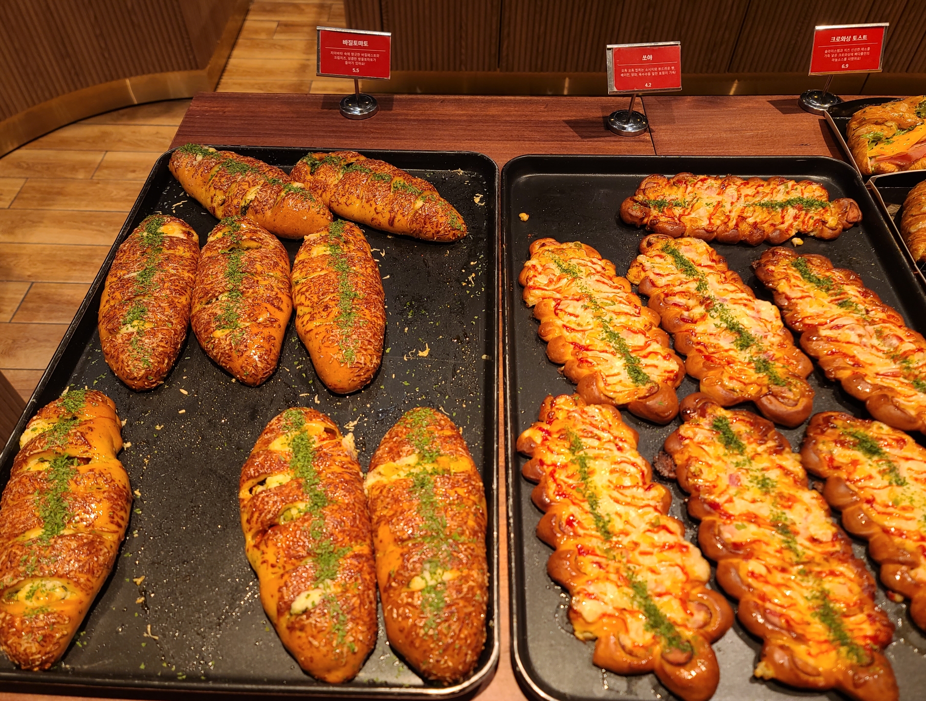 소세지가 돌돌말려있는 빵과 옆에는 크림을 납작하게 만들어놓은 빵이예요. 둘 다 먹어봤었는데 맛있습니다.