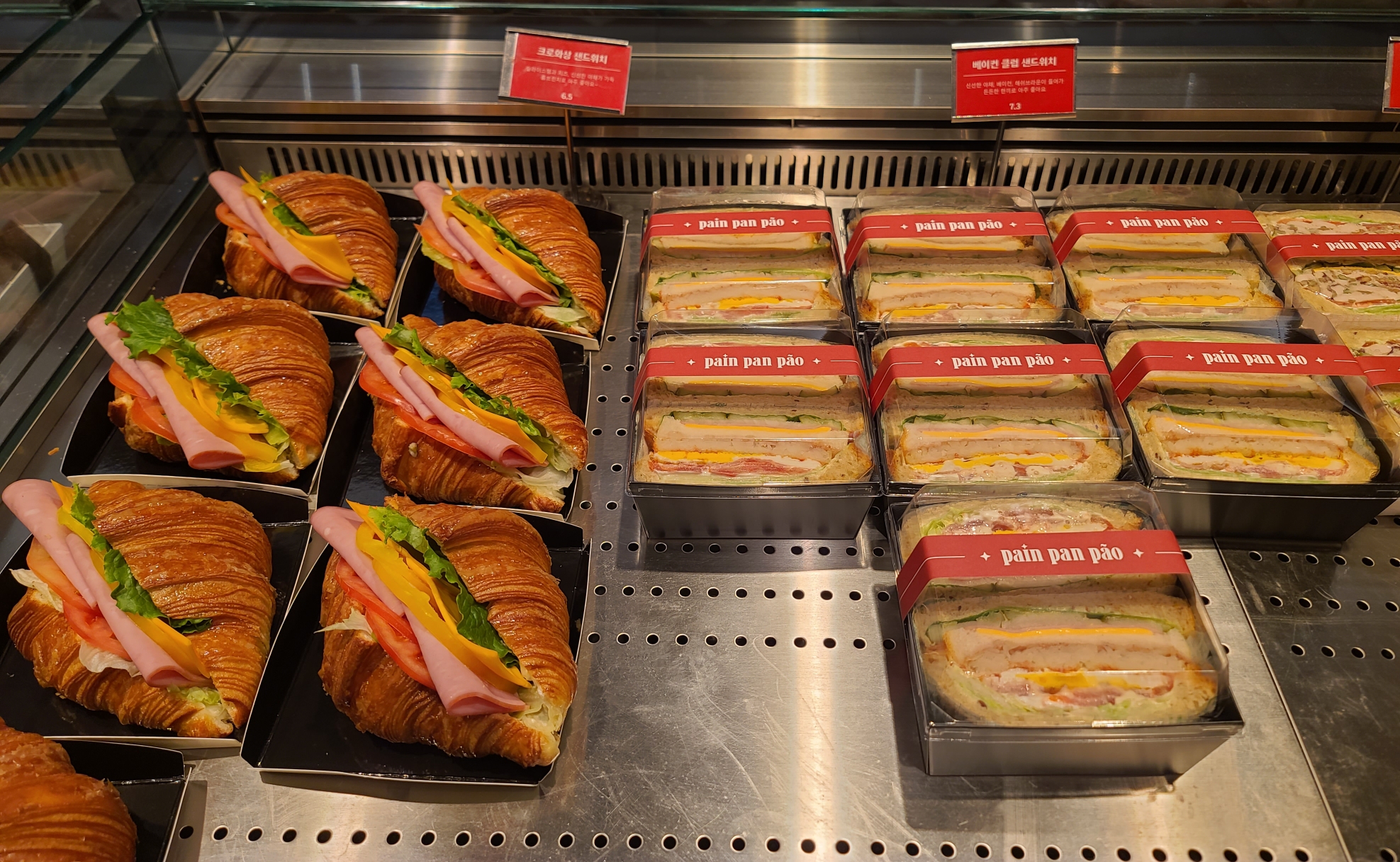 크로와상 샌드위치와 다양한 토핑의 샌드위치들