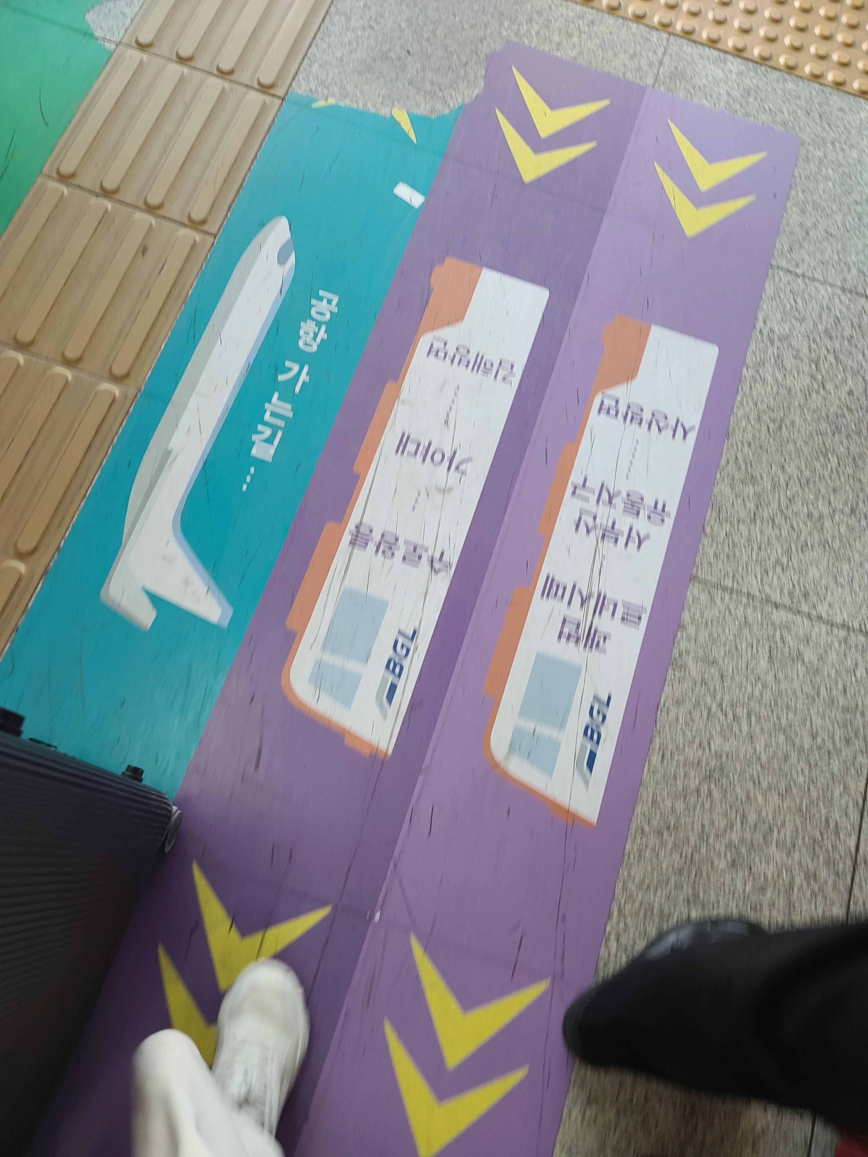 김해공항으로 들어가는 부산 공항역 입구 부분입니다. 바닥에 김해공항 가는 길, 지하철을 타는 길이 각기 다른 색으로 표시되어 있습니다.