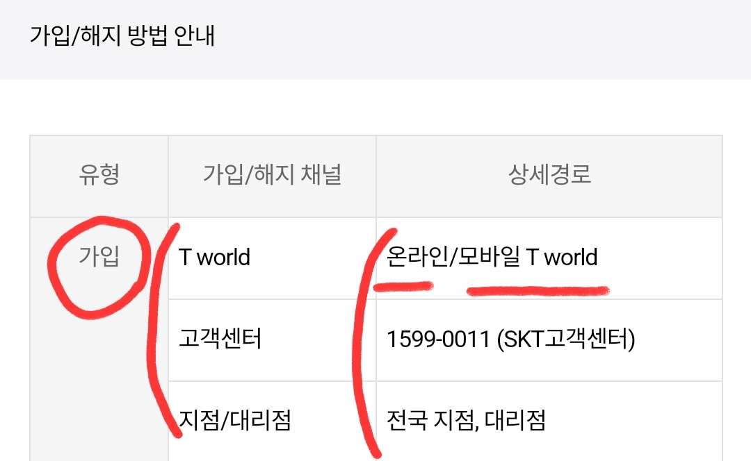 가입은 T월드, 고객센터 전화, 지점 또는 대리점을 통해서 가능하지만 해지는 T월드로는 불가합니다. 반드시 지점 또는 대리점을 톧하거나 고객센터로 전화하셔야해요.