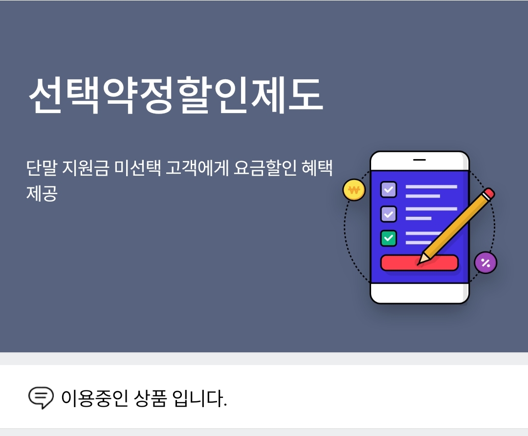 기기변경, 번호이동 등을 통해 새로운 폰을 구매할 때 공시지원금을 받거나 선택약정제도를 통해 요금을 할인받아 구매하게됩니다. 어쩌면 벌써 할인을 받고 계실지도 모르겠네요. 저도 저는 몰랐지만 이미 할인혜택이 들어가 있는 상태더라고요.
