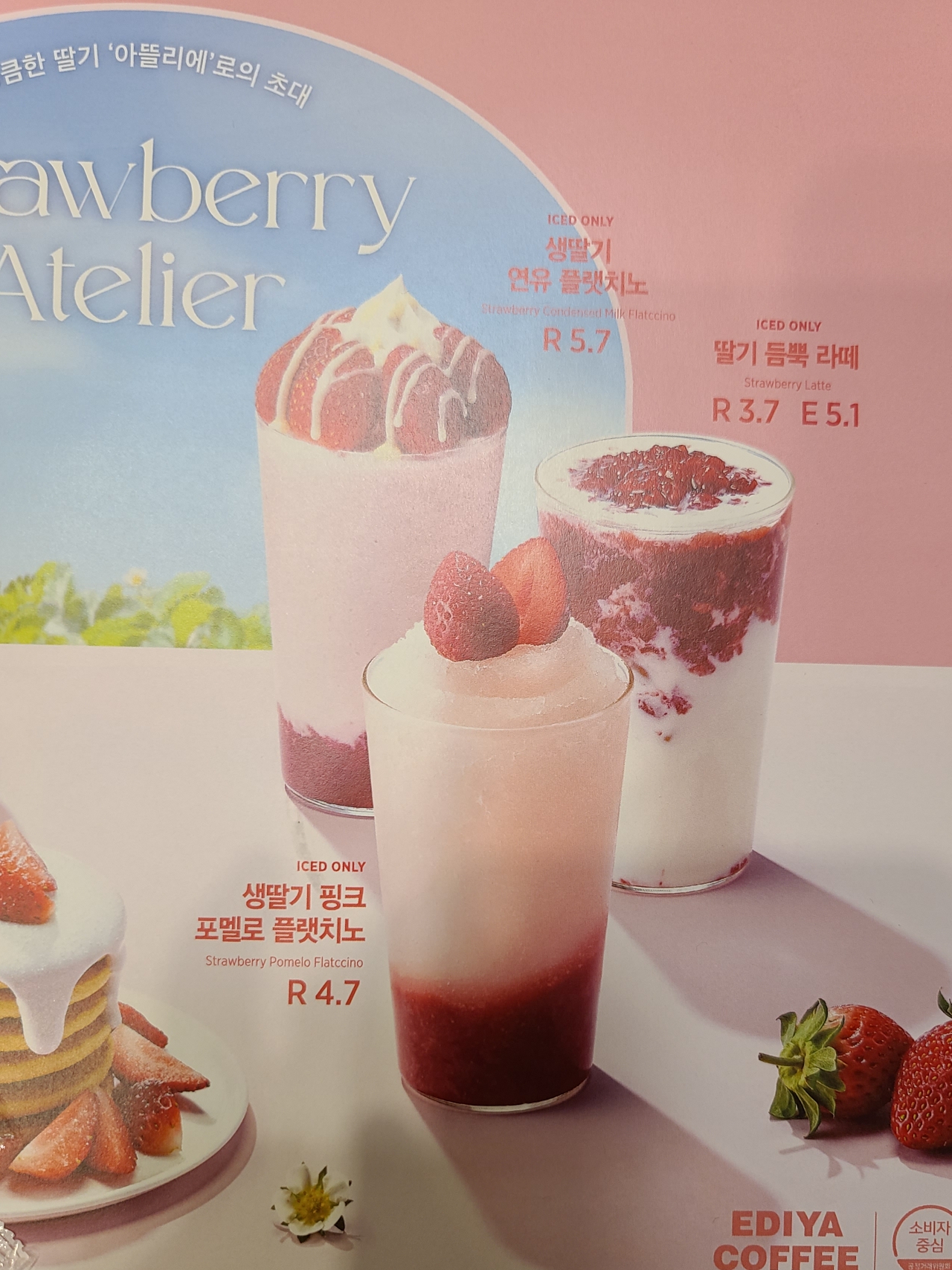 이디야 딸기 신메뉴 뿐만 아니라 이곳 저곳에서 딸기 관련된 메뉴들을 선보이고 있습니다. 저는 이디야 딸기 신메뉴인 생딸기 핑크 포멜로 플랫치노를 먹어봤어요. 이디야 딸기 메뉴 중 가장 상큼해보이는 것을 선택해보았답니다.