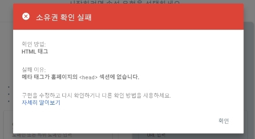 </head>와 헷갈려 HTML코드를 잘못 넣게된다면 이런 창이 뜨게됩니다. 소유권 확인 실패라는 창이 떳을 경우 3번 <head>뒷편에 복사 코드를 넣은 것이 맞는 지 확인해주세요.