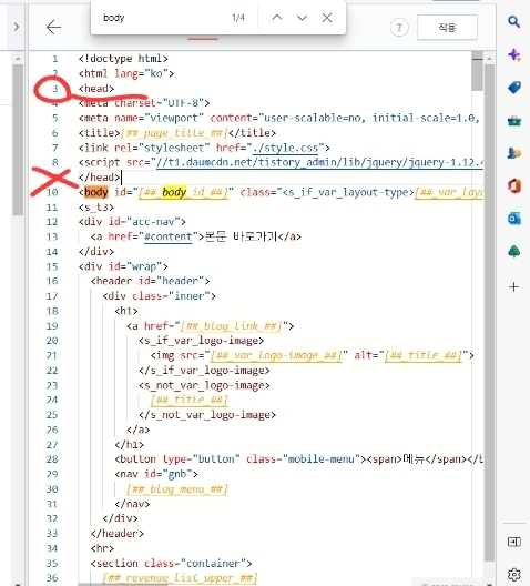 티스토리 HTML편집에 들어오면 오른쪽편에 HTML 코드가 쭈욱 뜰겁니다. 우리는 이 중에서 <head>라고 되어있는 코드를 찾아야합니다. 구글 서치 콘솔에서 원하는 <head>는 <body>라고 되어있는 코드가 나오기 직전의 <head>를 의미하며 </head>와 헷갈리기 쉽습니다.
