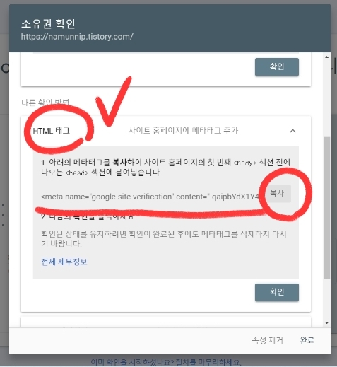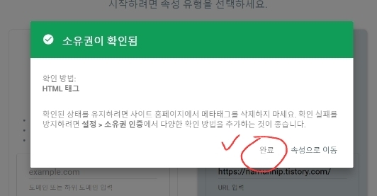 HTML코드가 정확하게 들어갔다면 이런 창이 뜰겁니다. 축하드립니다. 소유권이 확인되었습니다.