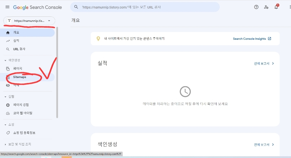 HTML코드를 붙여넣기 후 적용까지 완료했다면, 다시 구글 서치 콘솔 화면으로 되돌아옵니다.