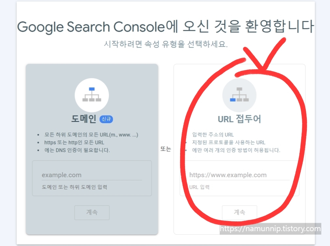 구글 서치 콘솔 등록 방법은 총 2가지로 도메인 등록 또는 URL접두어 등록이 있습니다. 저희는 URL접두어 등록을 통해 티스토리 구글 노출을 노려볼거예요.