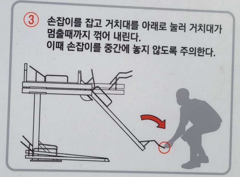 3. 손잡이를 잡고 거치대를 아래로 누릅니다. 거치대가 멈출 때까지 꺾어 바닥으로 내려주세요. 요때 손잡이를 꽉 잡고 계세요!