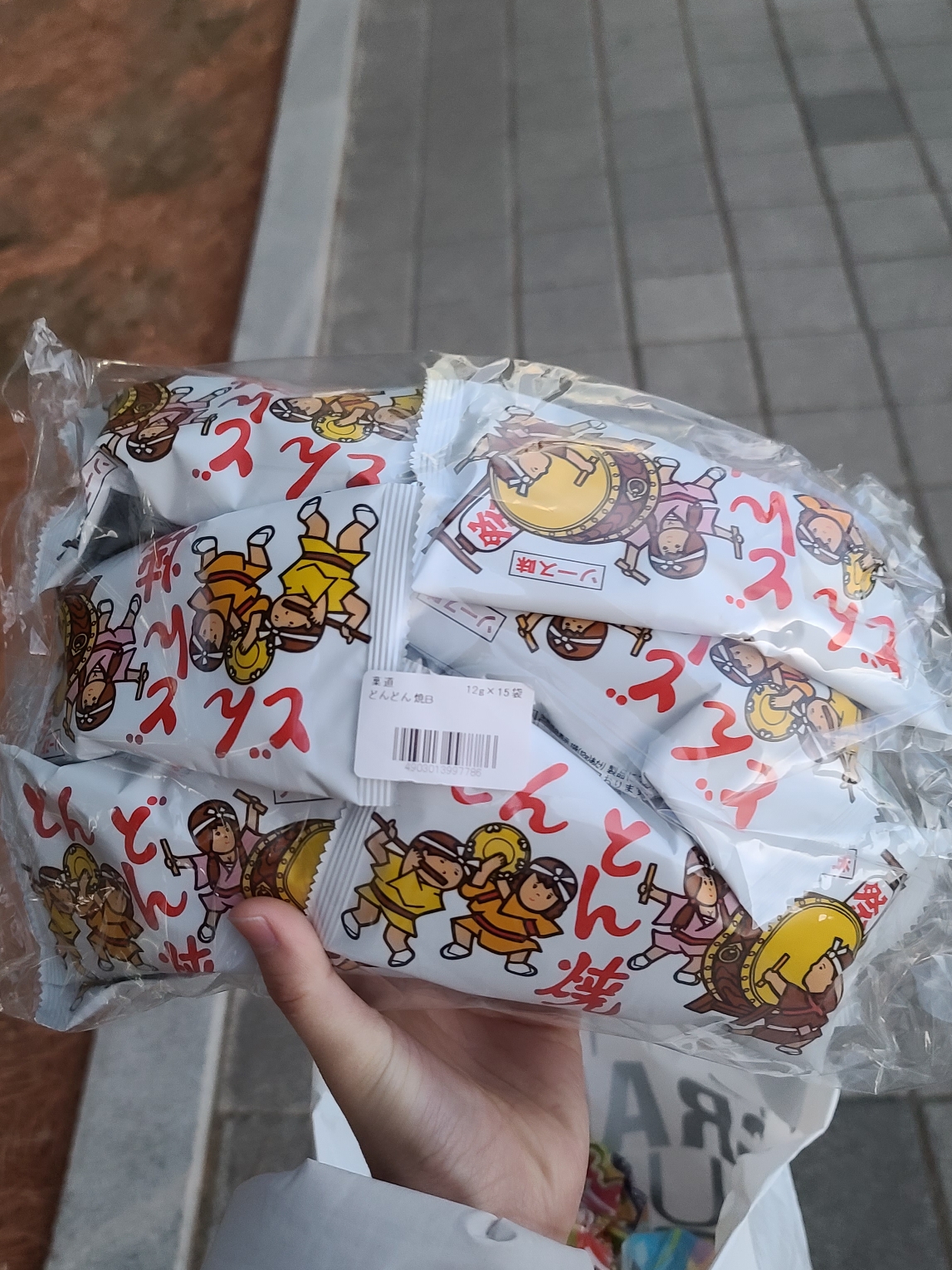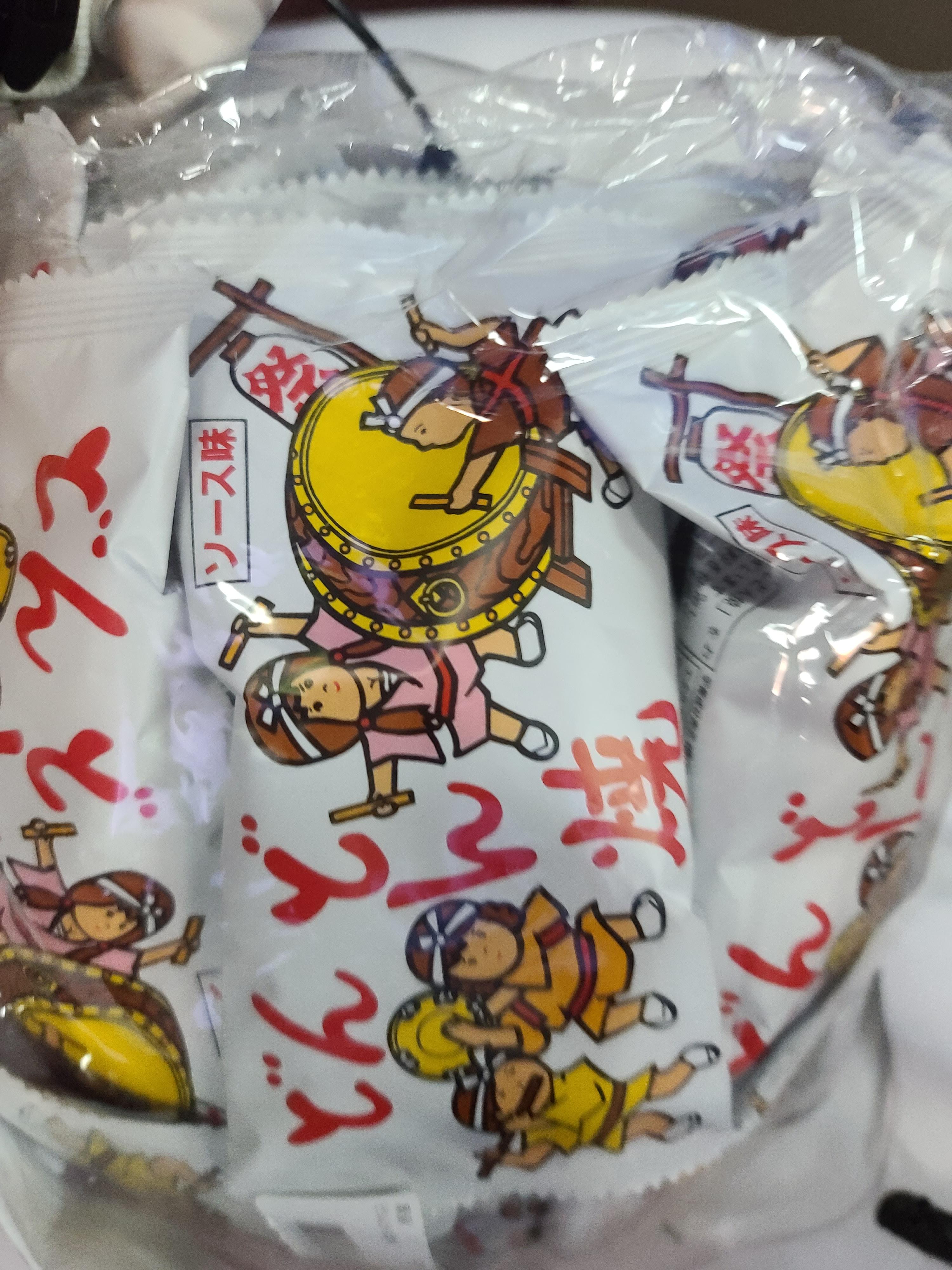 포장지에서 귀여운 캐릭터들이 신명 나게 북 치고 탬버린 흔들고 피리 불고 있어요. 일본과자 돈돈야키 막과자 사고 싶으시다면 이것만 기억하세요.