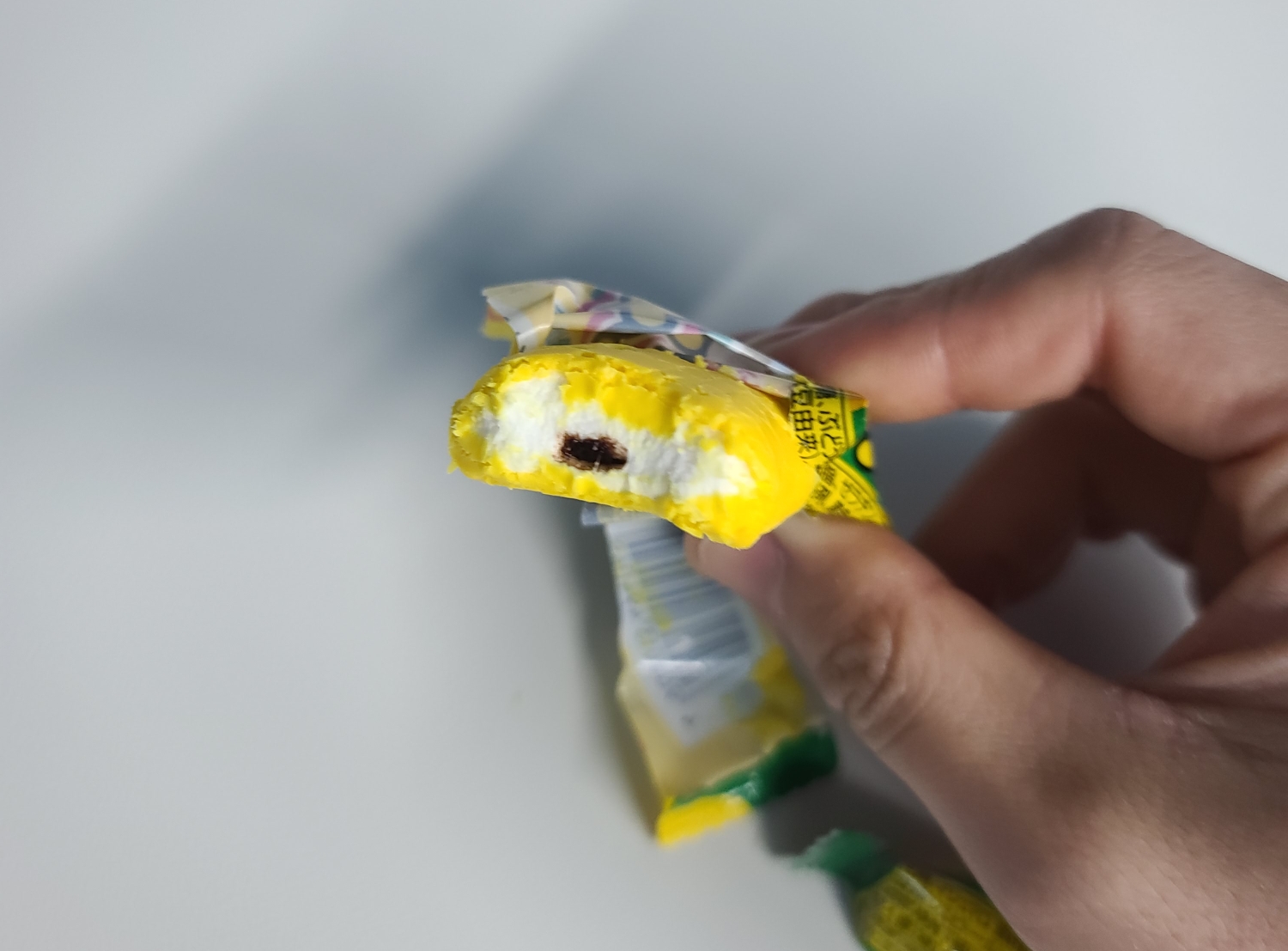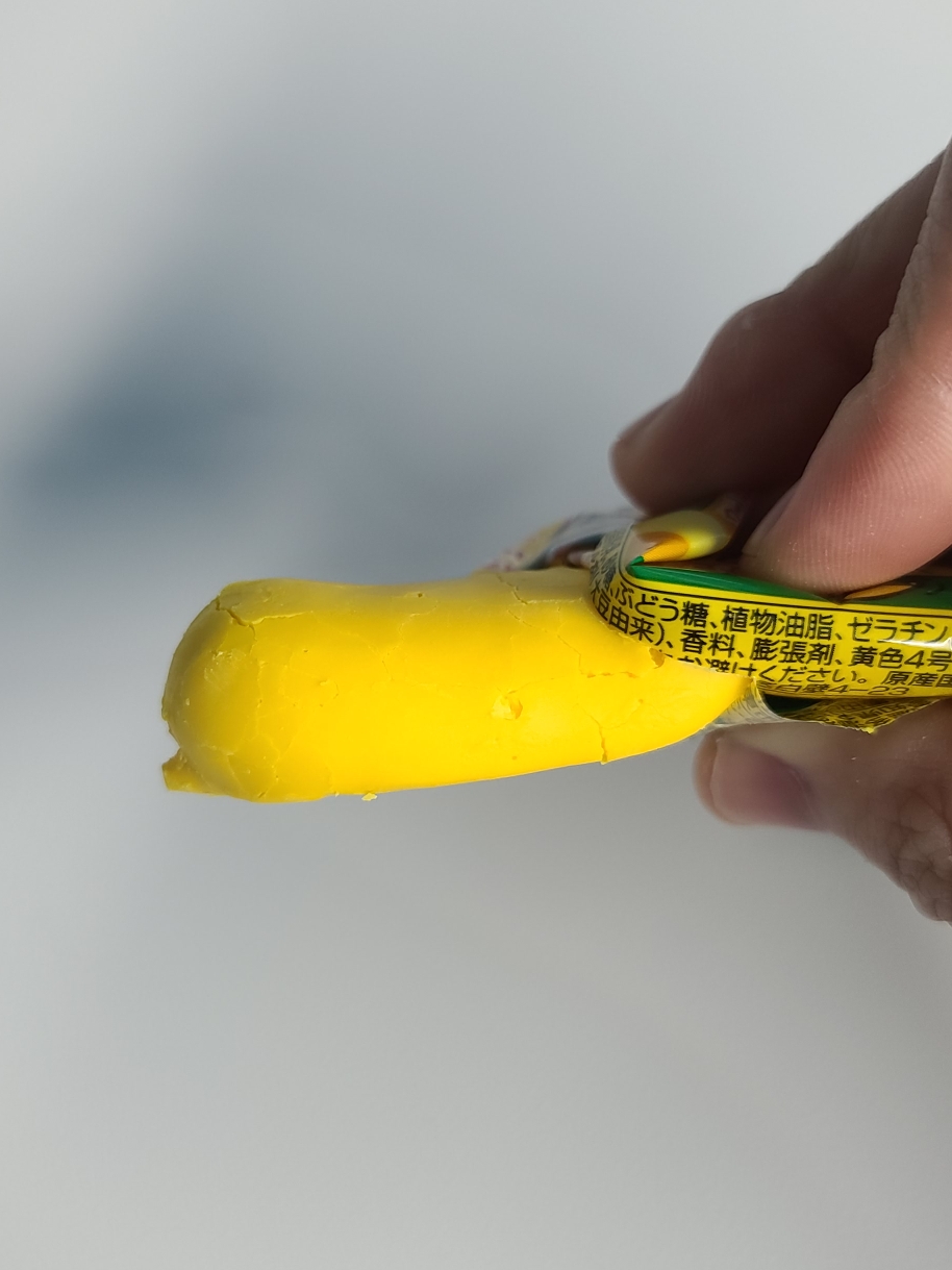 직접 먹어보려고 포장지를 오픈했어요. 노란 마시멜로가 모습을 드러냈는데요.. 바나나향이 가득합니다.