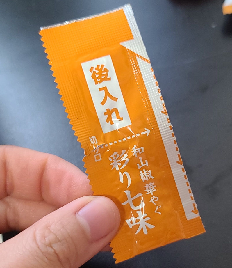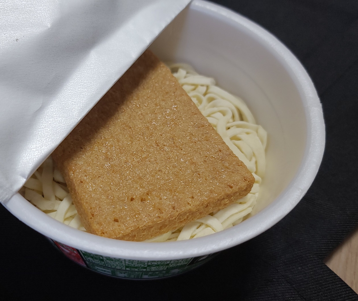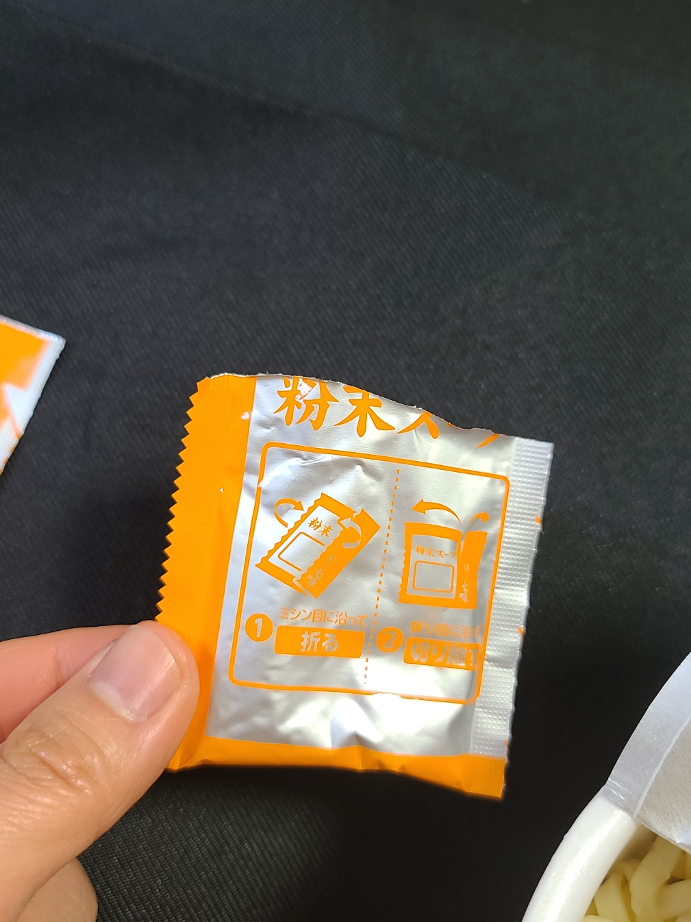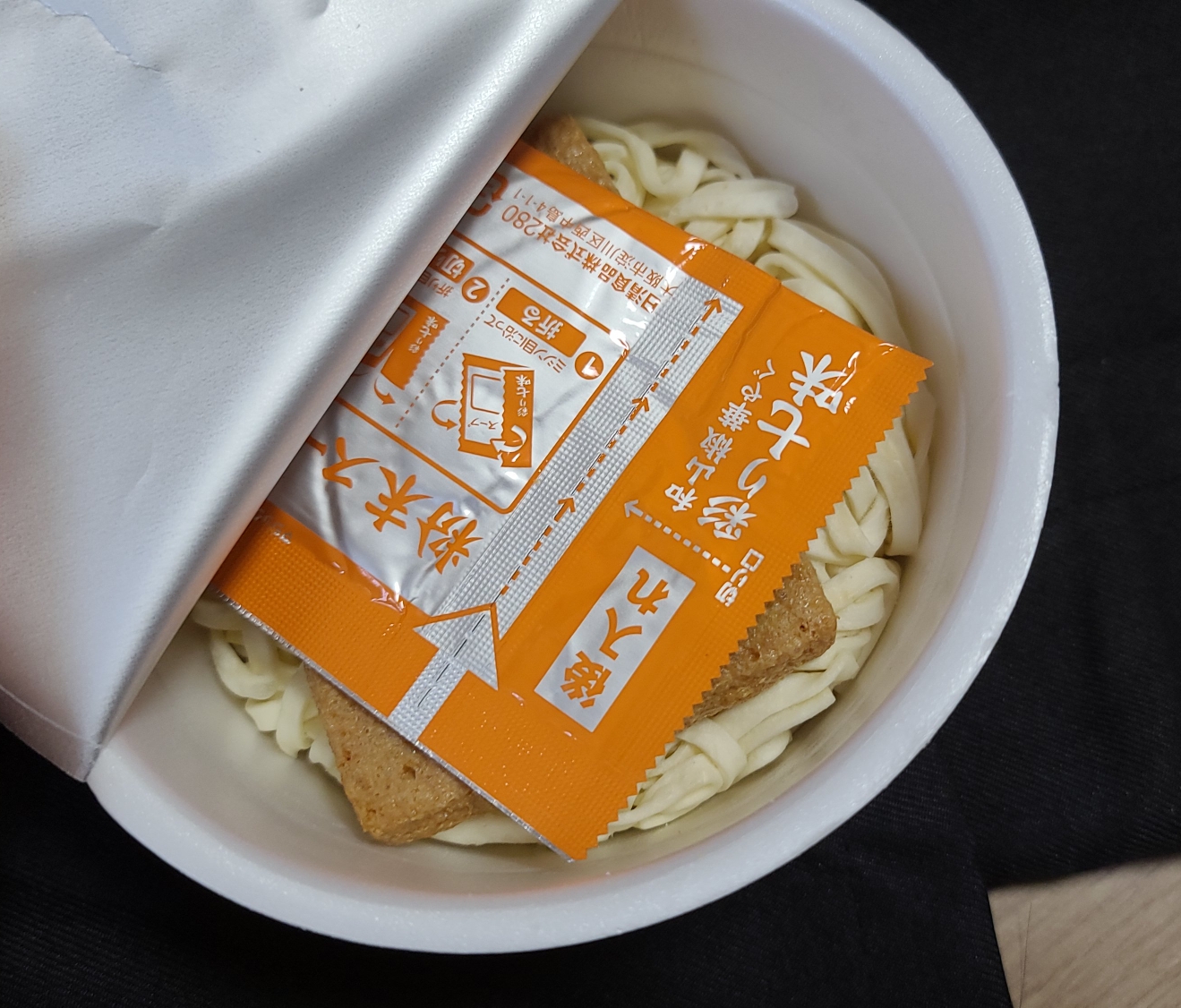 보통 일본 컵라면의 경우 스프가 면 위에 뿌려져있는 경우가 많지요. 그래서 특별히 신경쓸 것 없이 물만 부어서 먹으면 됩니다. 하지만 이 닛신 돈베이 키츠네 유부우동은 스프가 들어있었어요.