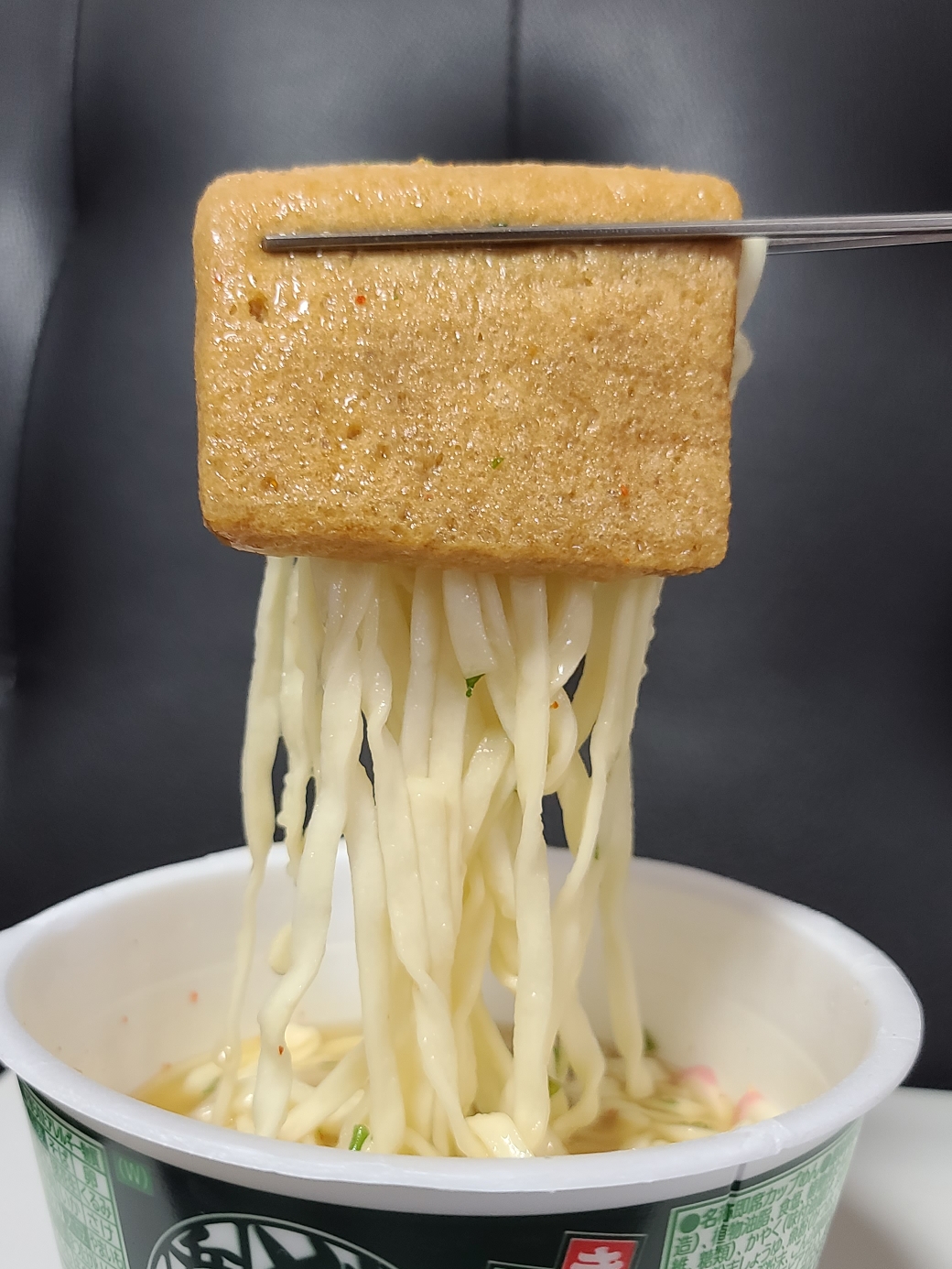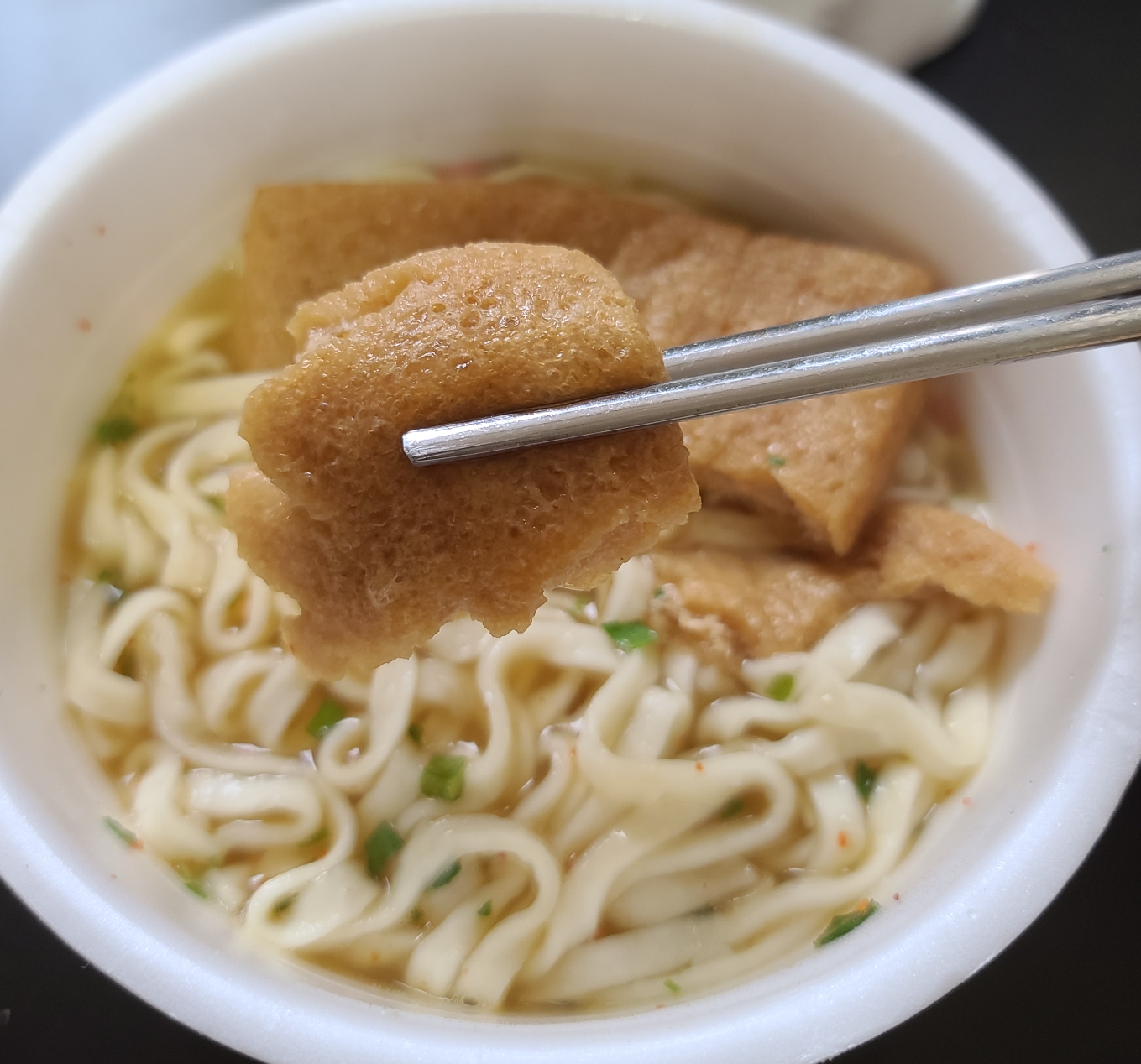 쯔유의 나라답게 유부우동 컵라면 국물에서 쯔유의 맛이 살짝 납니다. 유부가 국물을 머금고있어 촉촉하게 먹을 수 있었구요. 국물이 조금 짰는데, 유부와 함께 국물을 먹으니 단짠단짠해서 맛있었습니다.