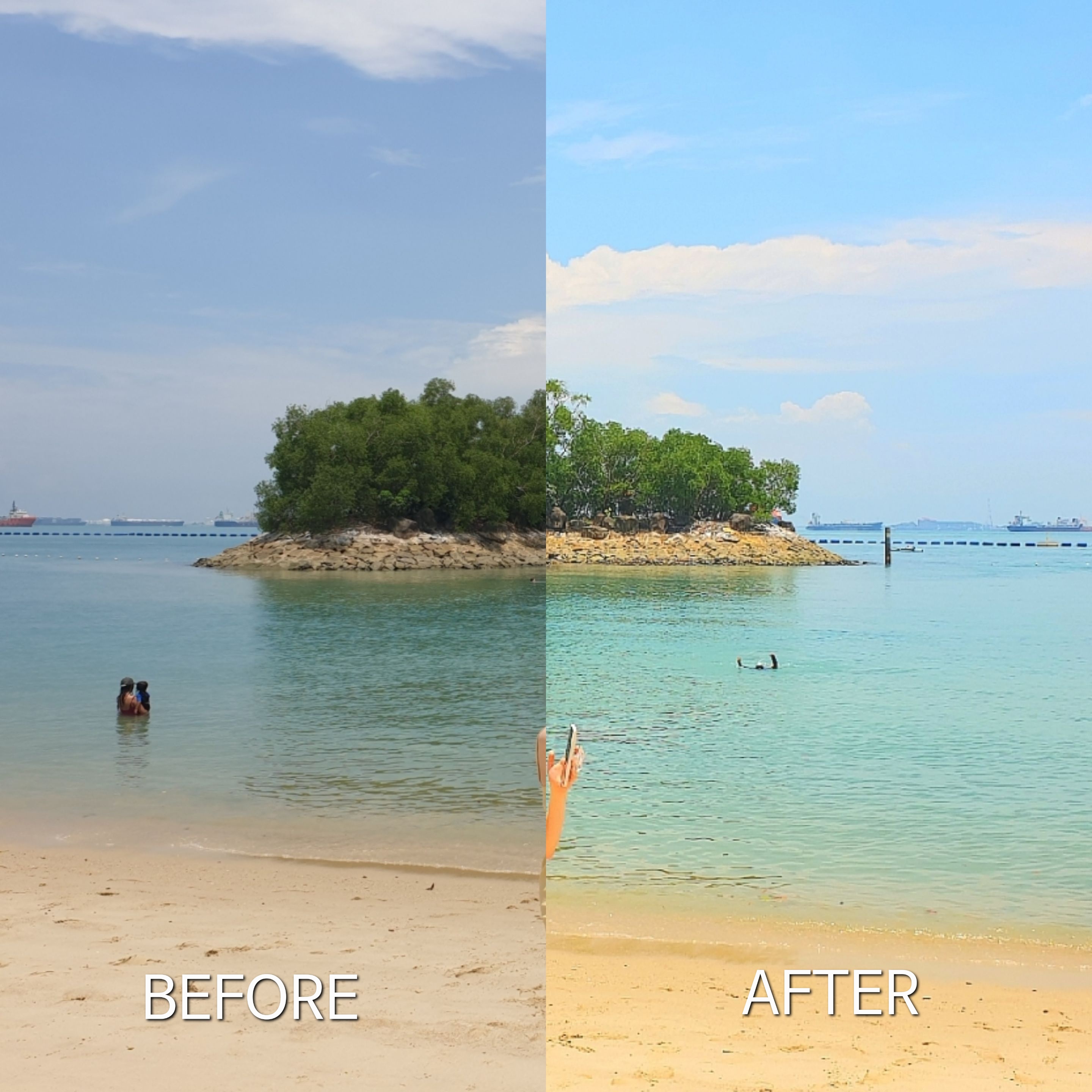 센토사 섬의 바다가 갤럭시 사진 보정으로 새롭게 탄생했습니다. 푸른 빛깔과 해변의 모래가 생동감있게 변했네요 !